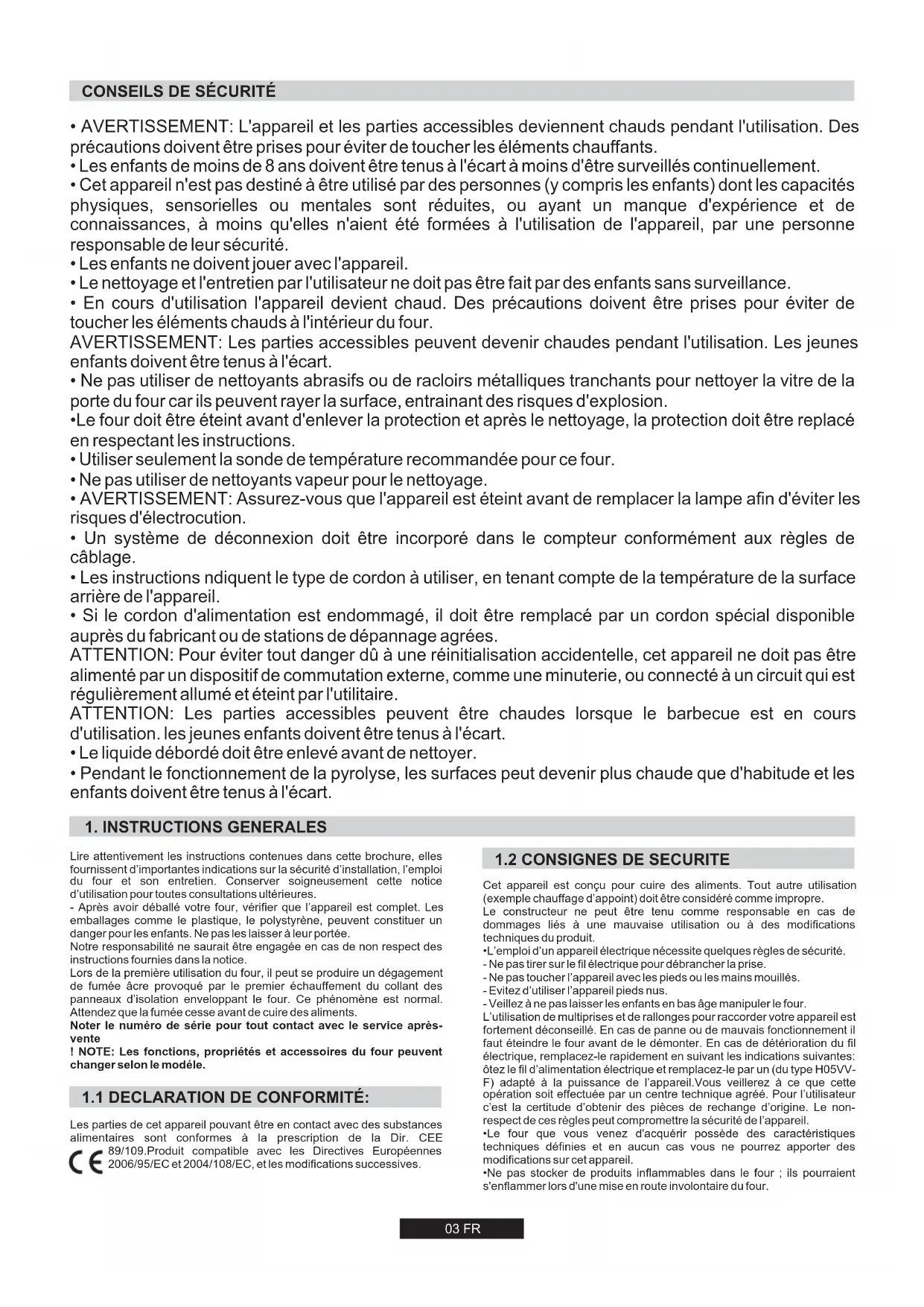 1.2 CONSIGNES DE SECURITE Cet appareil est conçu pour cuire des aliments. Tout autre utilisation