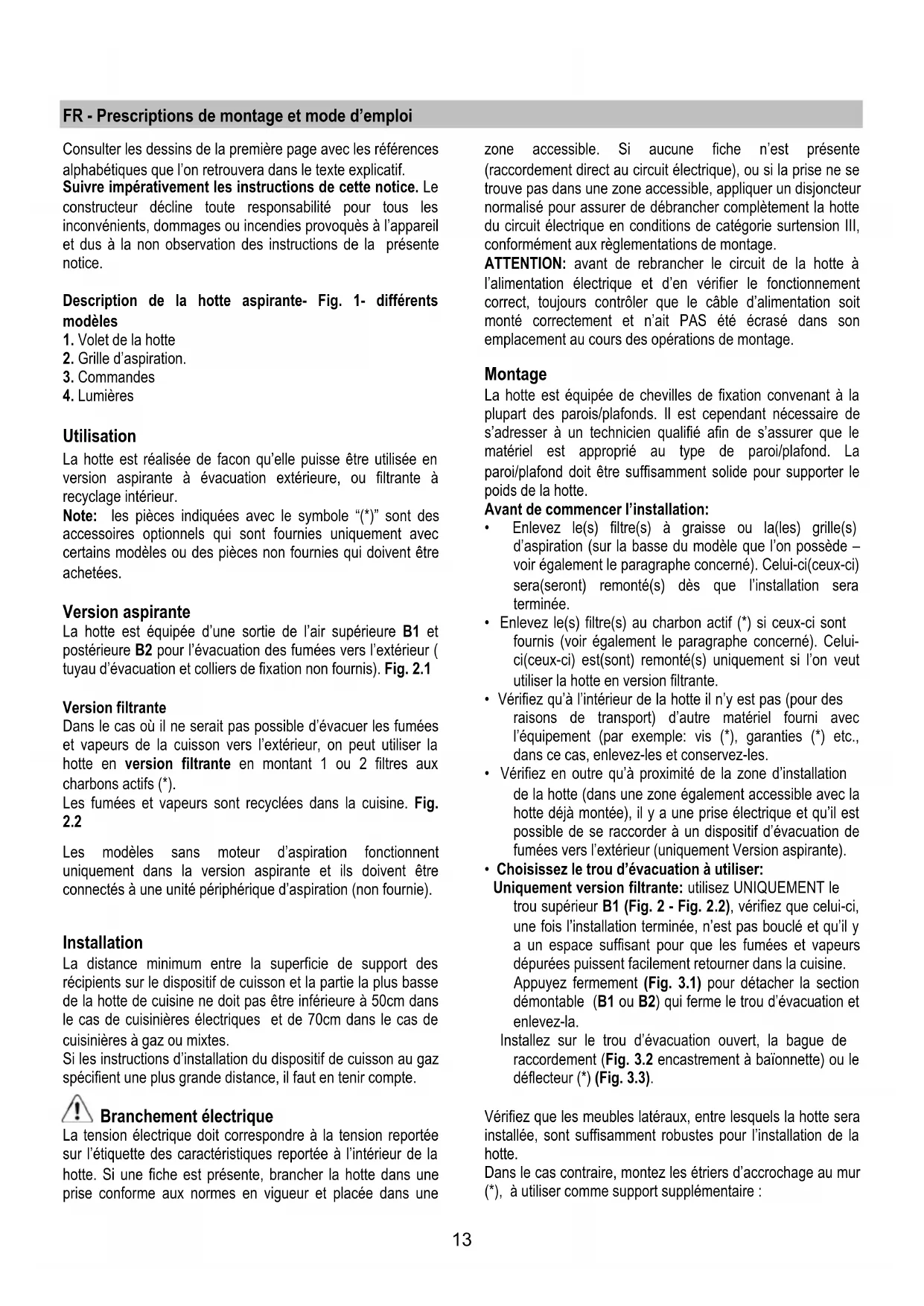 Description de la hotte aspirante- Fig. 1- différents
