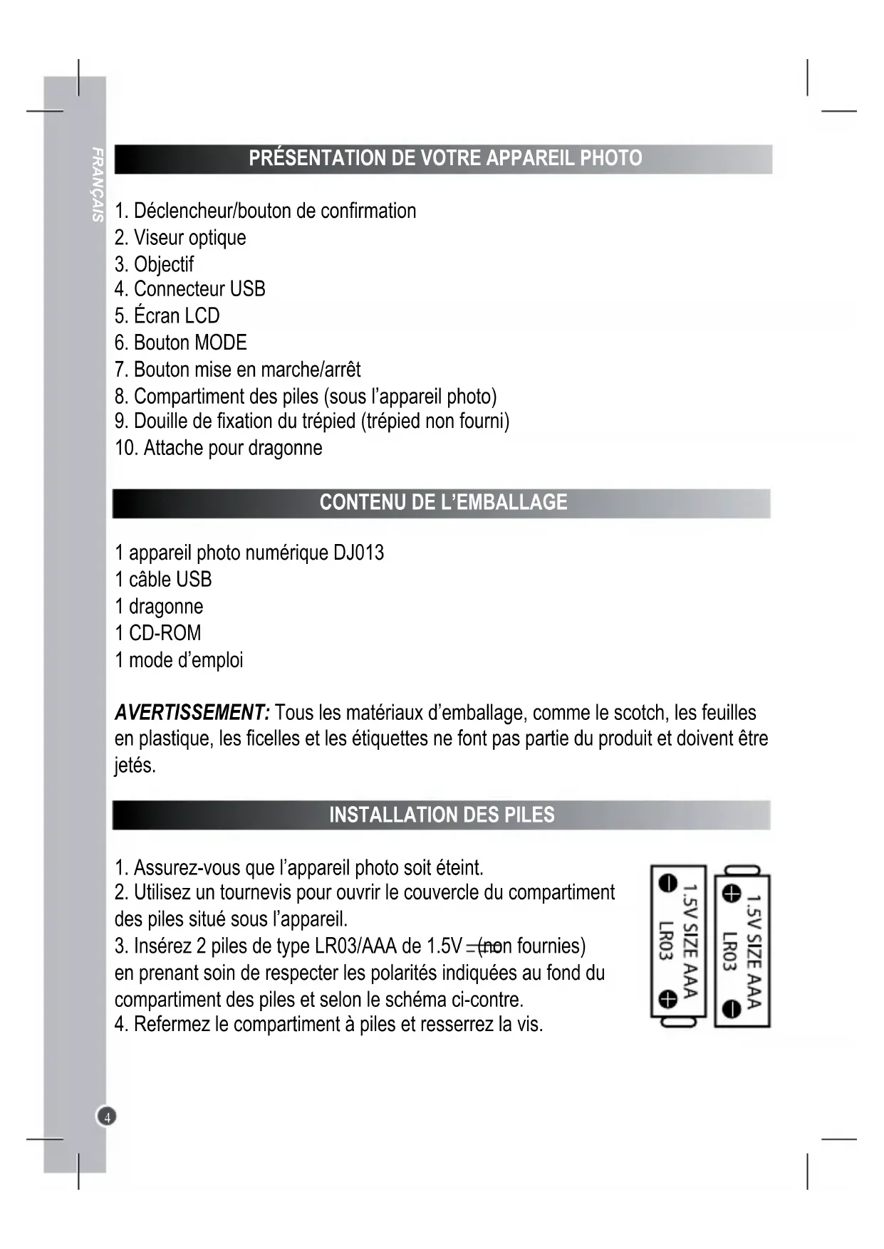 1 appareil photo numérique DJ013 1 câble USB 1 dragonne 1 CD-ROM 1 mode d’emploi