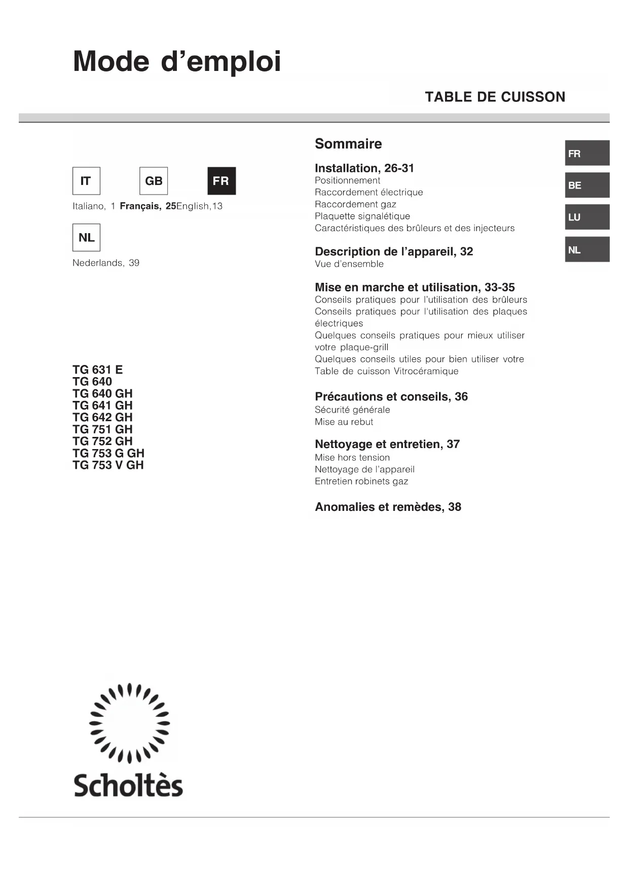 MODE D'EMPLOI TG 641 GH AN SCHOLTES