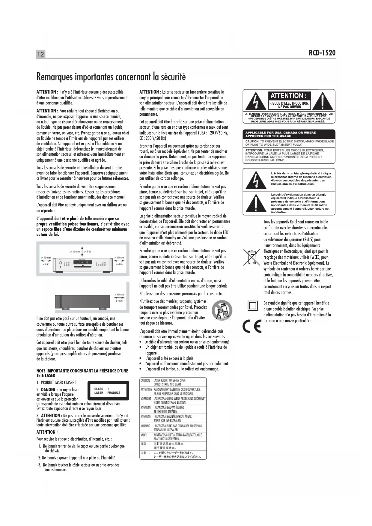 - L’appareilesttombé,oulecoffretestendommagé. NOTE IMPORTANTE CONCERNANT LA PRÉSENCE D’UNE TÊTE LASER1. PRODUIT LASER CLASSE 1 2. DANGER : un rayon laser est visible lorsque l’appareil est ouvert et que la protection correspondante est défaillante ou volontairement désactivée. Évitez toute exposition directe à ce rayon laser3. ATTENTION : Ne pas retirer le couvercle supérieur. Il n’y a à l’intérieur aucune pièce susceptible d’être modifiée par l’utilisateur ; toute intervention doit être effectuée par une personne qualifiéeATTENTION !Pour réduire le risque d’électrisation, d’incendie, etc. : 1. Ne jamais retirer de vis, le capot ou une partie quelconque du châssis 2. Ne jamais exposer l’appareil à la pluie ou l’humidité. 3. Ne jamais toucher le câble secteur ou sa prise avec des mains humides. ATTENTION : RISQUE D’ÉLECTROCUTION. NE PAS OUVRIRATTENTION : POUR RÉDUIRE LE RISQUE D’ÉLECTROCUTION, NE PAS RETIRER LE CAPOT. IL N’Y A À L’ INTÉRIEUR AUCUNE PIÈCE SUSCEPTIBLE D'ÊTRE MODIFIÉE PA R L’ UTILISATEUR. EN CAS DE PROBLÈME, ADRESSEZ-VOUS À UN RÉPARATEUR AGRÉÉ. L’ éclair dans un triangle équilatéral indique la présence interne de tensions électriques élevées susceptibles de présenter des risques graves d’électrocution.Le point d’exclamation dans un triangle équilatéral indique à l’utilisateur la présence de conseils et d’informations importantes dans le manuel d’utilisation accompagnant l’appareil. Leur lecture est impérative.13 Français Au sujet de Rotel Notre histoire commence il y a environ 50 ans. Depuis, au fil des années, nous avons reçu des centaines de prix et de récompenses, et satisfait des centaines de milliers de personnes – comme vous !Rotel a été fondée par une famille passionnée de musique, qui a décidé de fabriquer des maillons Haute Fidélité sans compromis aucun. Depuis sa création, cette passion est restée intacte, et cette famille s’est fixée comme objectif de proposer à tous les audiophiles et mélomanes les meilleurs appareils possibles, quel que soit leur budget. Une volonté partagée par tous les employés de Rotel.Les ingénieurs Rotel travaillent selon une équipe très soudée, écoutant, peaufinant chaque nouveau modèle jusqu’à ce qu’il atteigne exactement leurs standards – très élevés – de musicalité. Ils sont libres de choisir des composants en provenance du monde entier, afin de concevoir le produit le meilleur possible. C’est ainsi que vous trouverez dans nos appareils des condensateurs d’origine britannique ou allemande, des transistors japonais ou américains, tandis que les transformateurs toriques sont toujours fabriqués dans nos propres usines Rotel.Nous sommes tous concernés par la qualité de l’environnement. Et, comme de plus en plus de produits électroniques sont fabriqués puis éliminés quelques années plus tard, il est désormais essentiel qu’un constructeur fabrique tous ses produits en veillant à ce qu’ils aient un impact minimum sur la terre et les nappes phréatiques.Chez Rotel, nous sommes très fiers d’apporter notre pierre à ce nouvel édifice. Nous avons réduit la teneur en plomb de nos électroniques, en utilisant notamment une soudure spéciale ROHS, tandis que notre nouvelle gamme d’amplificateurs fonctionnant en classe D (non numérique) présente un rendement cinq fois supérieur aux générations conventionnelles précédentes, délivrant pourtant encore plus de puissance, avec une qualité encore supérieure. Ces appareils ne chauffent pas, dépensent beaucoup moins d’énergie, sont donc très bons pour l’environnement tout en étant encore plus musicaux.En plus, nous imprimons tous nos catalogues et manuels sur papier recyclé.Ce ne sont certes que de petites étapes. Mais ne sont-ce pas justement les plus importantes ? Nous continuons activement la recherche et la mise au point de nouvelles méthodes, et l’utilisation de nouveaux matériaux pour aboutir à un processus de fabrication général plus écologique et plus propre.Tous les membres de l’équipe Rotel vous remercient pour l’achat de cet appareil. Nous sommes persuadés qu’il vous offrira de nombreuses années d’intense plaisir musical. Au sujet du RCD-1520 Le RCD-1520 a tout simplement été conçu pour ne faire qu’une chose – délivrer le son le plus détaillé, et le plus nuancé possible, à partir de n’importe quel disque CD. Qu’il s’agisse d’un CD conventionnel, ou d’un CD gravé avec des fichiers codés MP3 ou WMA, le RCD-1520 reproduit très fidèlement tout ce qui est enregistré sur le disque. Sommaire Figure 1: Commandes et branchements 3Figure 2: Télécommande RR-D97 3Figure 3: Sorties analogiques 4Figure 4: Sorties numériques 4Remarques importantes 5Remarques importantes concernant la sécurité ..........................12Au sujet de Rotel ...............................................13 Au sujet du RCD-1520 . . . . . . . . . . . . . . . . . . . . . . . . . . . . . . . . . . . . . . . . . . . 13 Démarrage. . . . . . . . . . . . . . . . . . . . . . . . . . . . . . . . . . . . . . . . . . . . . . . . . . . . 14Quelques précautions 14Installation 14Identification des commandes 14 Alimentation électrique et mise en service . . . . . . . . . . . . . . . . . . . . . . . . . . . . . 14 Prise d’alimentation secteur 14Interrupteur de mise sous tension et indicateur Power