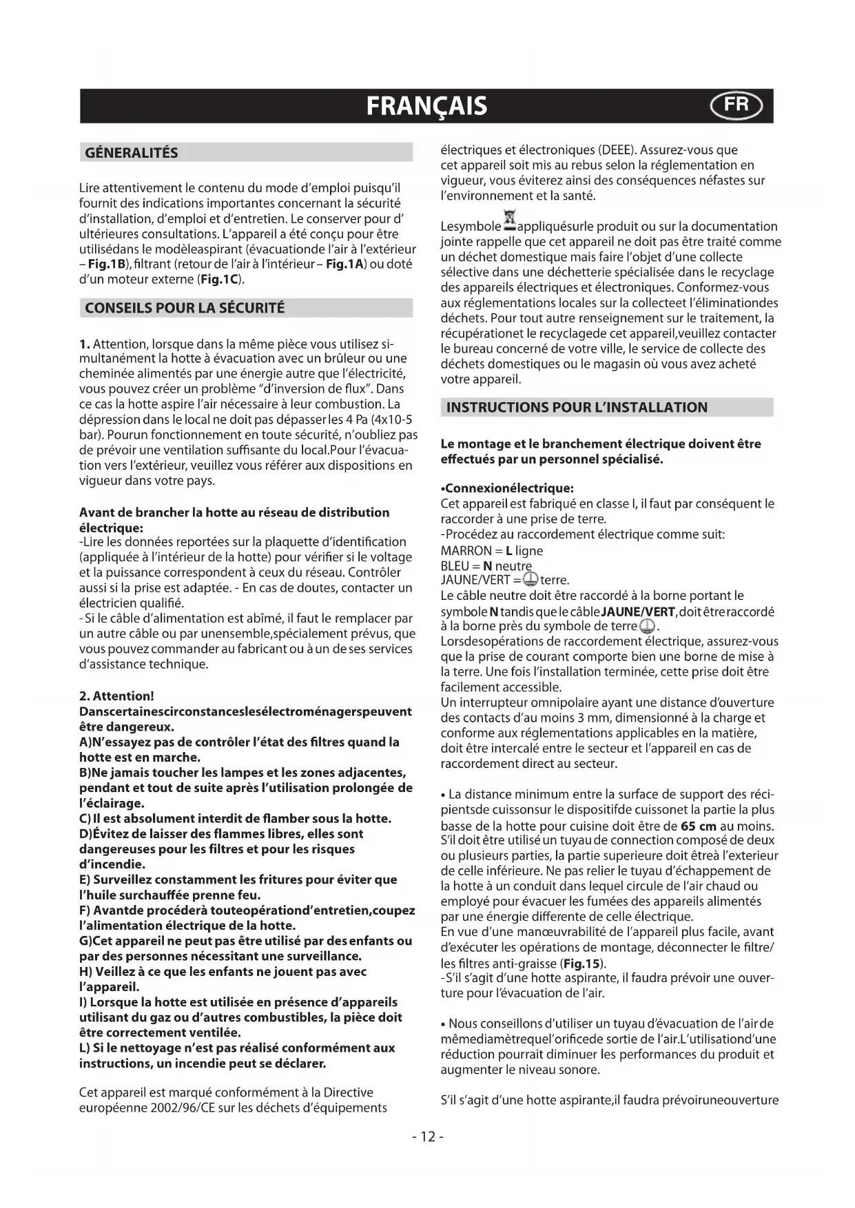 Lire attentivement le contenu du mode d’emploi puisqu’il fournit des indications importantes concernant la sécurité d’installation, d’emploi et d’entretien. Le conserver pour d’ ultérieures consultations. L’appareil a été conçu pour être utilisédans le modèleaspirant (évacuationde l’air à l’extérieur – Fig.1B), ltrant (retour de l’air à l’intérieur – Fig.1A) ou doté d’un moteur externe (Fig.1C).