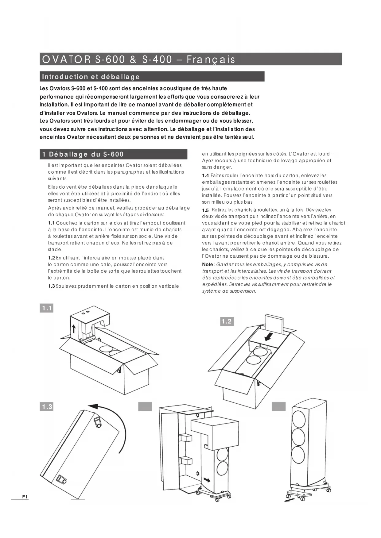 ENGLISH, DEUTSCH, FRANÇAIS, I T A L I A N O , ESPAñOL, NEDERLANDS, 中文F1 OVATOR S-600 & S-400 – Français Introduction et déballage Les Ovators S-600 et S-400 sont des enceintes acoustiques de très haute performance qui récompenseront largement les efforts que vous consacrerez à leur installation. Il est important de lire ce manuel avant de déballer complètement et d’installer vos Ovators. Le manuel commence par des instructions de déballage. Les Ovators sont très lourds et pour éviter de les endommager ou de vous blesser, vous devez suivre ces instructions avec attention. Le déballage et l’installation des enceintes Ovator nécessitent deux personnes et ne devraient pas être tentés seul. 1 Déballage du S-600 Il est important que les enceintes Ovator soient déballées comme il est décrit dans les paragraphes et les illustrations suivants. Elles doivent être déballées dans la pièce dans laquelle elles vont être utilisées et à proximité de l’endroit où elles seront susceptibles d’être installées. Après avoir retiré ce manuel, veuillez procéder au déballage de chaque Ovator en suivant les étapes ci-dessous: