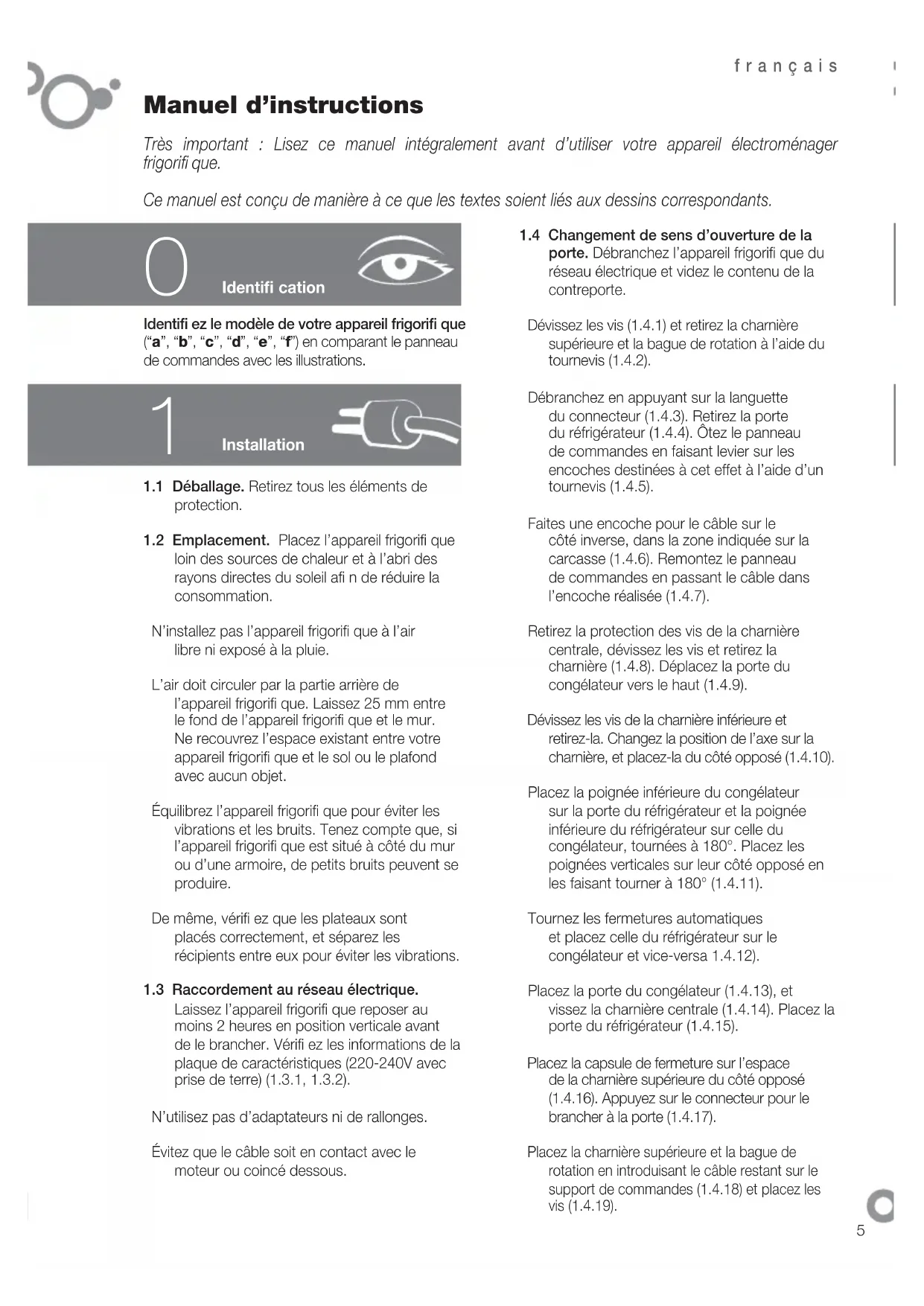Manuel d’instructions Très important : Lisez ce manuel intégralement avant d’utiliser votre appareil électroménager frigorifi que. Ce manuel est conçu de manière à ce que les textes soient liés aux dessins correspondants. Installation Identifi ez le modèle de votre appareil frigorifi que (“a”, “b”, “c”, “d”, “e”, “f”) en comparant le panneau de commandes avec les illustrations.