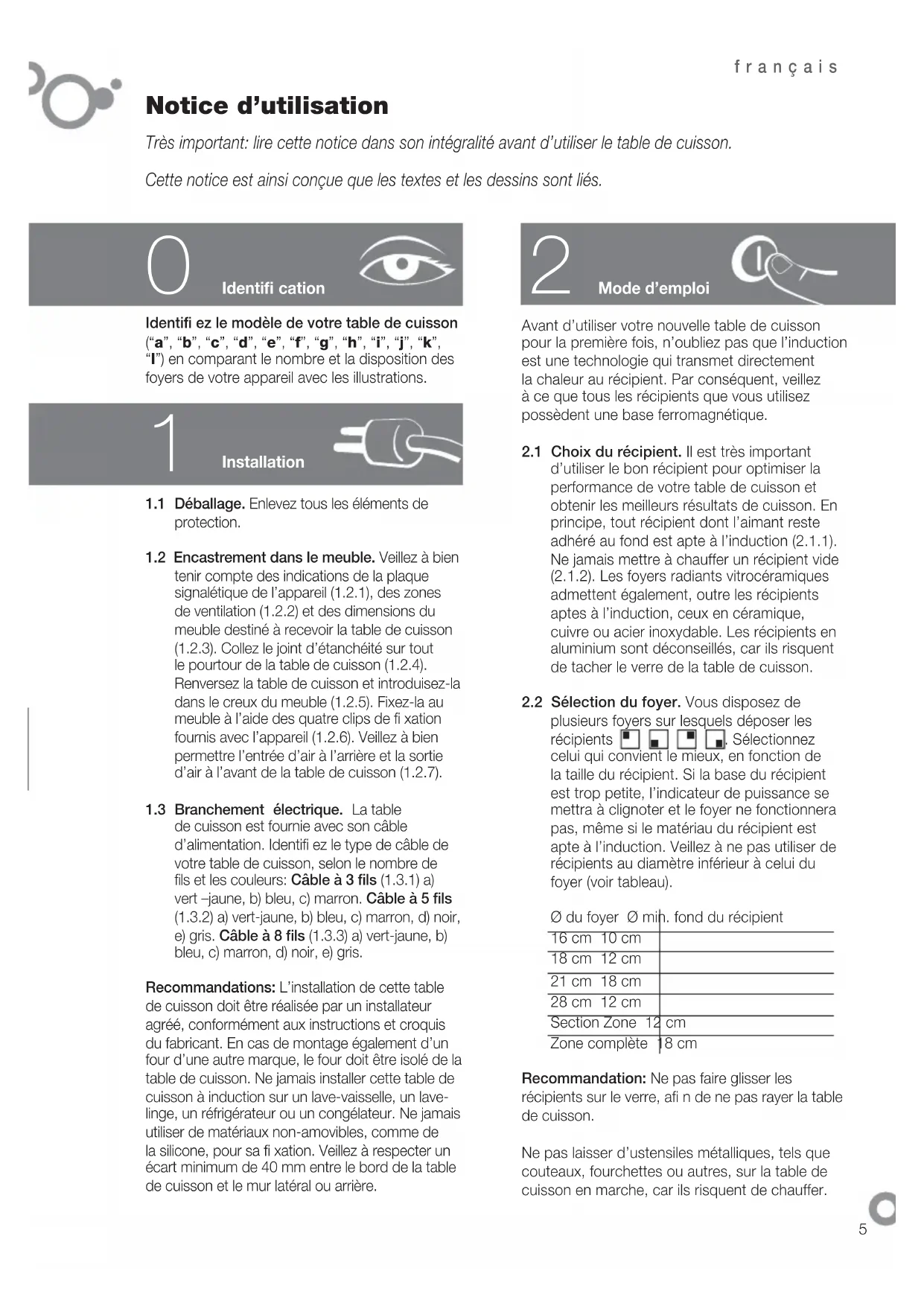 Notice d’utilisation Très important: lire cette notice dans son intégralité avant d’utiliser le table de cuisson. Cette notice est ainsi conçue que les textes et les dessins sont liés.