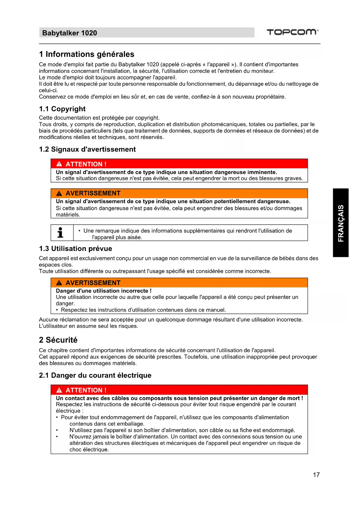 FRANÇAIS 1 Informations générales Ce mode d'emploi fait partie du Babytalker 1020 (appelé ci-après « l'appareil »). Il contient d'importantes informations concernant l'installation, la sécurité, l'utilisation correcte et l'entretien du moniteur. Le mode d'emploi doit toujours accompagner l'appareil. Il doit être lu et respecté par toute personne responsable du fonctionnement, du dépannage et/ou du nettoyage de celui-ci. Conservez ce mode d'emploi en lieu sûr et, en cas de vente, confiez-le à son nouveau propriétaire.