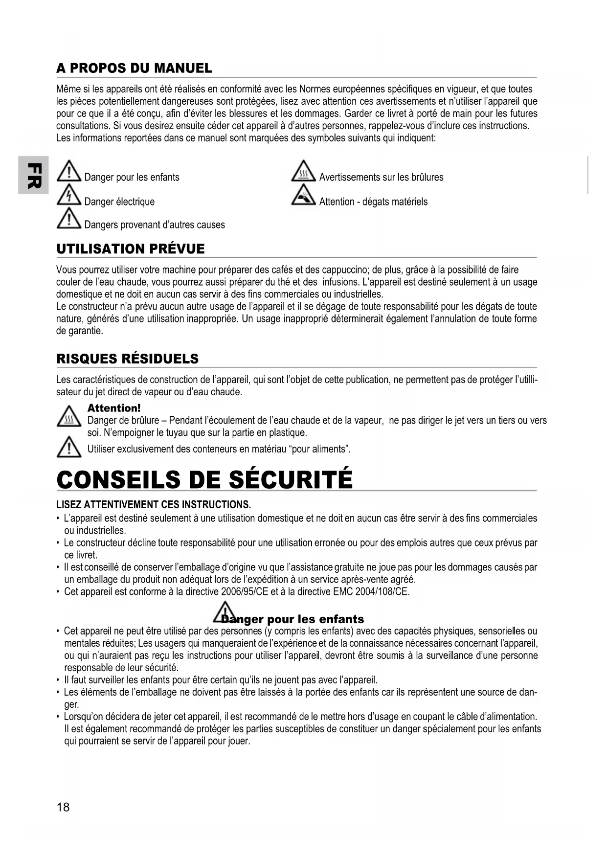 Même si les appareils ont été réalisés en conformité avec les Normes européennes spéciques en vigueur, et que toutes les pièces potentiellement dangereuses sont protégées, lisez avec attention ces avertissements et n’utiliser l’appareil que pour ce que il a été conçu, an d’éviter les blessures et les dommages. Garder ce livret à porté de main pour les futures consultations. Si vous desirez ensuite céder cet appareil à d’autres personnes, rappelez-vous d’inclure ces instrructions. Les informations reportées dans ce manuel sont marquées des symboles suivants qui indiquent: Danger pour les enfants Avertissements sur les brûlures Danger électrique Attention - dégats matériels Dangers provenant d’autres causes