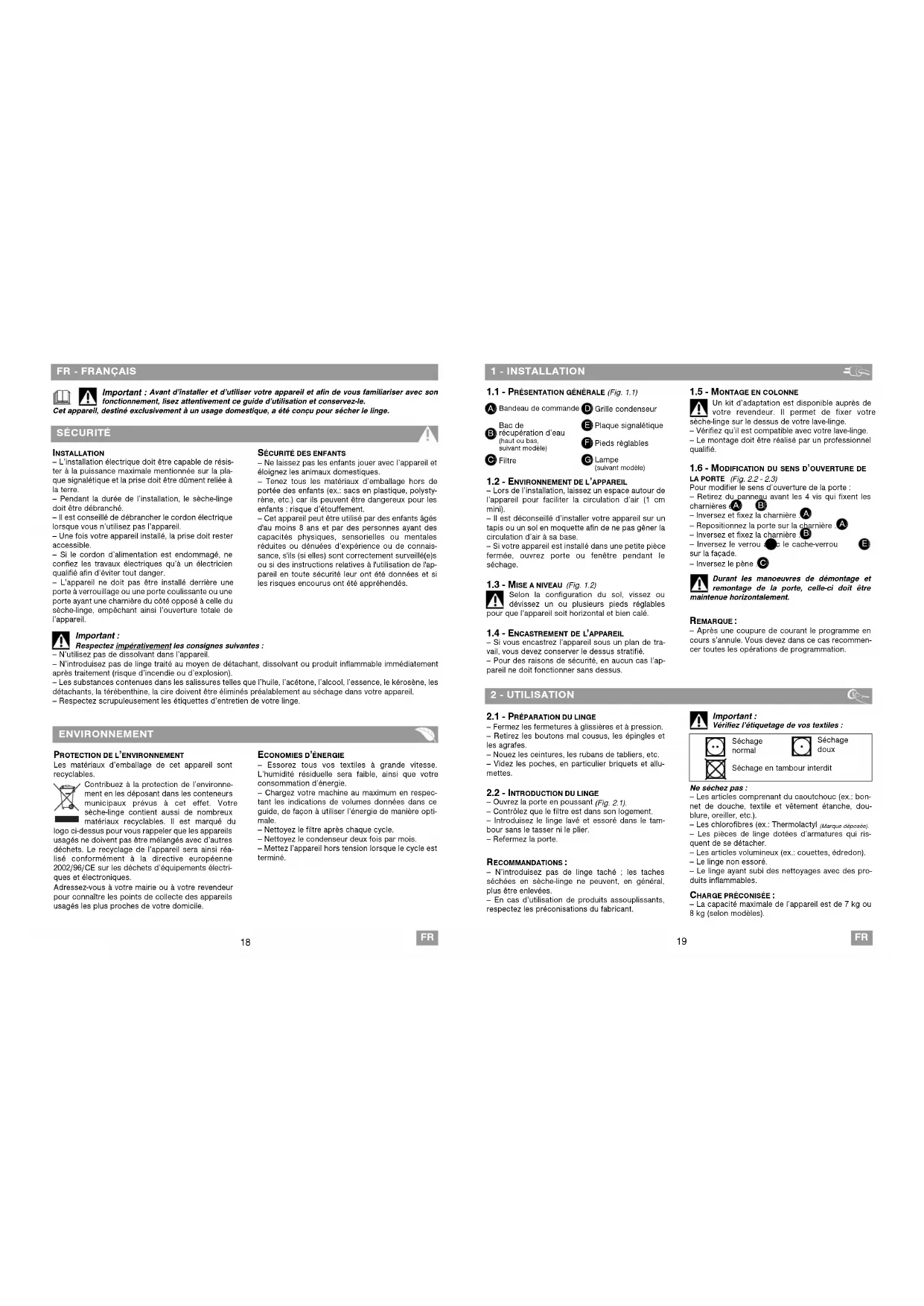 Cet appareil, destiné exclusivement à un usage domestique, a été conçu pour sécher le linge.