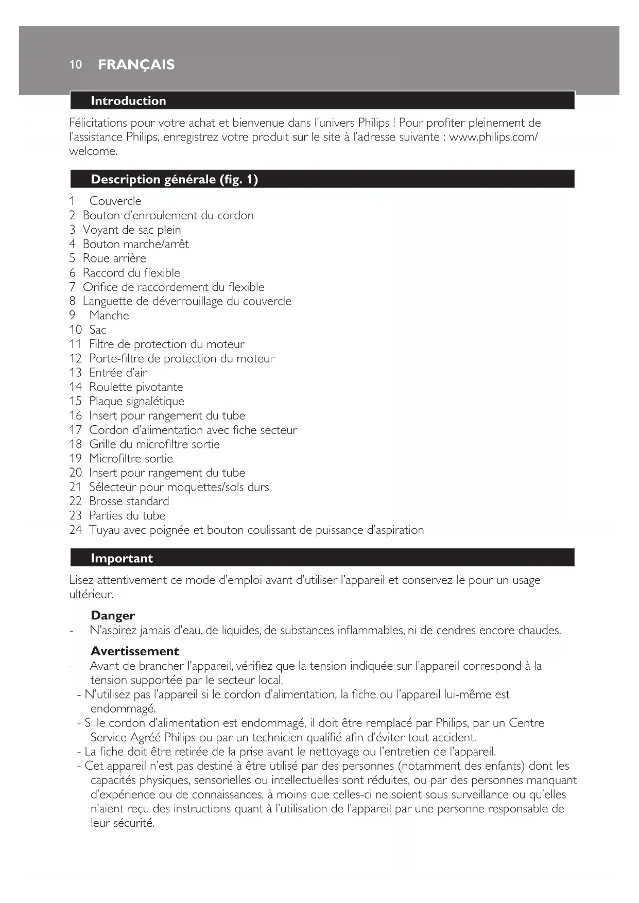 Note: Please visit www.s-bag.com for more information about the s-bag. Ordering lters and accessories - Exhaust micro lters are available under service number 4322 004 93681. - Motor protection lters are available under service number 4322 004 93671. Storage 1 Switch off and unplug the appliance, and pres the cord rewind button to rewind the cord (Fig. 14). 2 Put the appliance in upright position. To attach the nozzle to the appliance, insert the ridge on the nozzle into the storage slot. Environment - Do not throw away the appliance with the normal household waste at the end of its life, but hand it in at an ofcial collection point for recycling. By doing this, you help to preserve the environment (Fig. 15). Guarantee and service If you need service or information or if you have a problem, please visit the Philips website at www.philips.com or contact the Philips Consumer Care Centre in your country. You nd its phone number in the worldwide guarantee leaet. If there is no Consumer Care Centre in your country, go to your local Philips dealer. Troubleshooting 1 Thesuctionpowerisinsufcient - Perhaps the dustbag is full. If necessary, replace or empty the dustbag. - Perhaps the lters need to be cleaned or replaced. If necessary, clean or replace the lters. - Perhaps the nozzle, tube or hose is obstructed. Remove the obstruction. ENGLISH 910 Introduction Félicitations pour votre achat et bienvenue dans l’univers Philips ! Pour proter pleinement de l’assistance Philips, enregistrez votre produit sur le site à l’adresse suivante : www.philips.com/ welcome. Description générale (g. 1) 1 Couvercle 2 Bouton d’enroulement du cordon 3 Voyant de sac plein 4 Bouton marche/arrêt 5 Roue arrière 6 Raccord du exible 7 Orice de raccordement du exible 8 Languette de déverrouillage du couvercle 9 Manche 10 Sac 11 Filtre de protection du moteur 12 Porte-ltre de protection du moteur 13 Entrée d’air 14 Roulette pivotante 15 Plaque signalétique 16 Insert pour rangement du tube 17 Cordon d’alimentation avec che secteur 18 Grille du microltre sortie 19 Microltre sortie 20 Insert pour rangement du tube 21 Sélecteur pour moquettes/sols durs 22 Brosse standard 23 Parties du tube 24 Tuyau avec poignée et bouton coulissant de puissance d’aspiration Important Lisez attentivement ce mode d’emploi avant d’utiliser l’appareil et conservez-le pour un usage ultérieur. Danger - N’aspirez jamais d’eau, de liquides, de substances inammables, ni de cendres encore chaudes. Avertissement - Avant de brancher l’appareil, vériez que la tension indiquée sur l’appareil correspond à la tension supportée par le secteur local. - N’utilisez pas l’appareil si le cordon d’alimentation, la che ou l’appareil lui-même est endommagé. - Si le cordon d’alimentation est endommagé, il doit être remplacé par Philips, par un Centre Service Agréé Philips ou par un technicien qualié an d’éviter tout accident. - La che doit être retirée de la prise avant le nettoyage ou l’entretien de l’appareil. - Cet appareil n’est pas destiné à être utilisé par des personnes (notamment des enfants) dont les capacités physiques, sensorielles ou intellectuelles sont réduites, ou par des personnes manquant d’expérience ou de connaissances, à moins que celles-ci ne soient sous surveillance ou qu’elles n’aient reçu des instructions quant à l’utilisation de l’appareil par une personne responsable de leur sécurité. FRANÇAIS- Veillez à ce que les enfants ne puissent pas jouer avec l’appareil. - Ne dirigez pas le exible, le tube ou tout autre accessoire vers les yeux ou les oreilles et ne les placez pas dans votre bouche lorsqu’ils sont raccordés à l’aspirateur et que celui-ci est sous tension. - Ne mettez jamais d’éléments de l’aspirateur au lave-vaisselle. Attention - N’aspirez pas d’objets de grande taille car ils peuvent bloquer le passage de l’air dans le tube ou le exible. - Lorsque vous aspirez des cendres, du sable n, de la chaux, de la poussière de ciment ou d’autres substances similaires, les pores du sac et du ltre de protection du moteur peuvent se boucher. Si vous constatez une forte diminution de la puissance d’aspiration, remplacez le sac et nettoyez le ltre de protection du moteur. - N’utilisez jamais l’appareil sans sac ou sans ltre de protection du moteur. Cela pourrait endommager le moteur et réduire la durée de vie de l’appareil. Utilisez exclusivement les sacs S-bag
