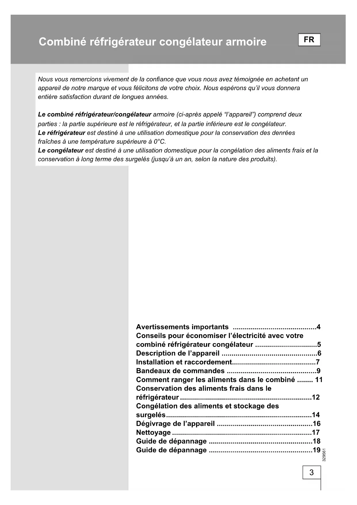 Инструкции за монтаж40329561 Nous vous remercions vivement de la confi ance que vous nous avez témoignée en achetant un appareil de notre marque et vous félicitons de votre choix. Nous espérons qu’il vous donnera entière satisfaction durant de longues années.Le combiné réfrigérateur/congélateur armoire (ci-après appelé “l’appareil”) comprend deux parties : la partie supérieure est le réfrigérateur, et la partie inférieure est le congélateur. Le réfrigérateur est destiné à une utilisation domestique pour la conservation des denrées fraîches à une température supérieure à 0°C. Le congélateur est destiné à une utilisation domestique pour la congélation des aliments frais et la conservation à long terme des surgelés (jusqu’à un an, selon la nature des produits). Avertissements importants 4