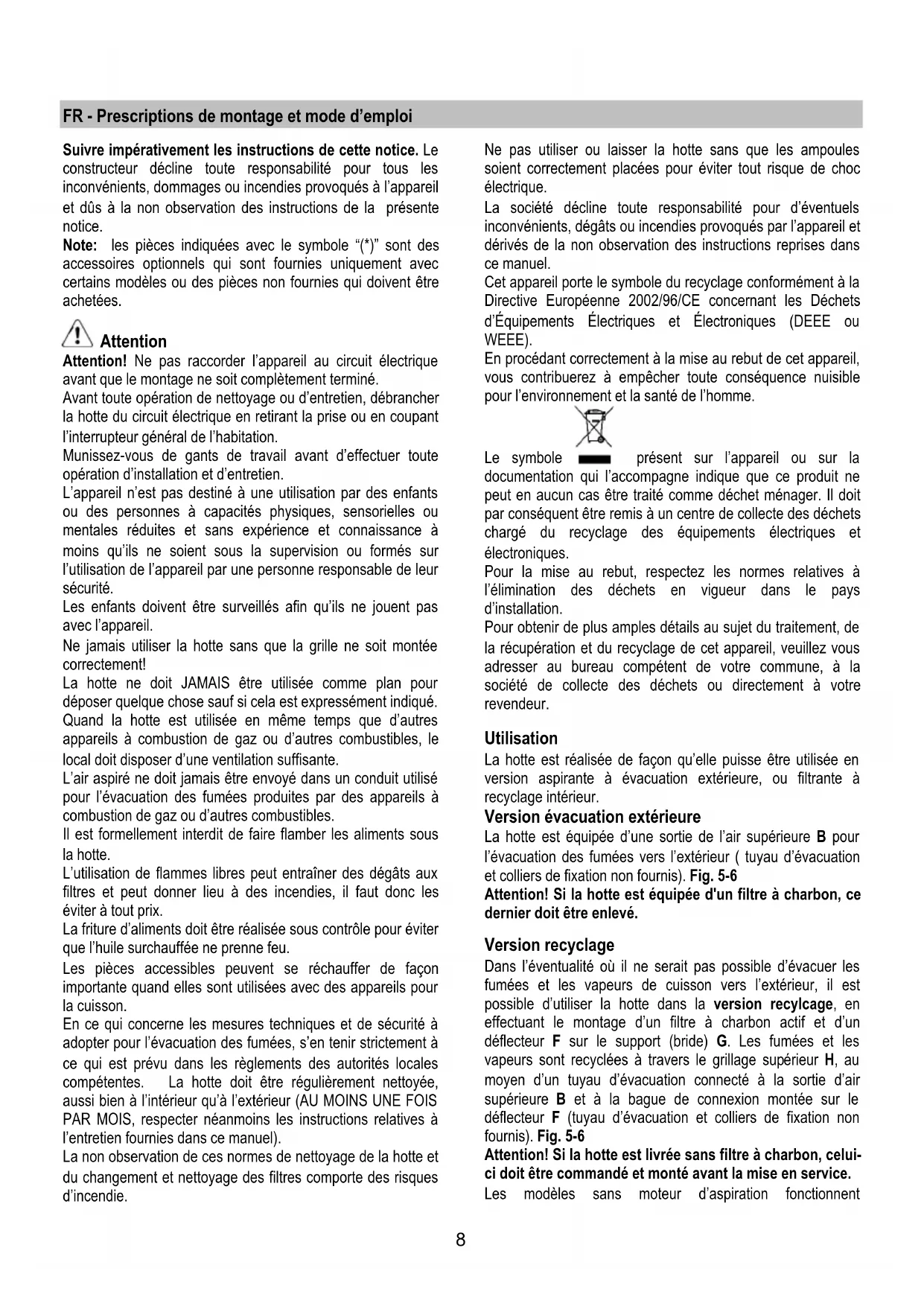 If the lights do not work, make sure that the lamps are fitted properly into their housings before you call for technical assistance.8 FR - Prescriptions de montage et mode d’emploi Suivre impérativement les instructions de cette notice. Le constructeur décline toute responsabilité pour tous les inconvénients, dommages ou incendies provoqués à l’appareil et dûs à la non observation des instructions de la présente notice. Note: les pièces indiquées avec le symbole “(*)” sont des accessoires optionnels qui sont fournies uniquement avec certains modèles ou des pièces non fournies qui doivent être achetées. Attention Attention! Ne pas raccorder l’appareil au circuit électrique avant que le montage ne soit complètement terminé. Avant toute opération de nettoyage ou d’entretien, débrancher la hotte du circuit électrique en retirant la prise ou en coupant l’interrupteur général de l’habitation. Munissez-vous de gants de travail avant d’effectuer toute opération d’installation et d’entretien. L’appareil n’est pas destiné à une utilisation par des enfants ou des personnes à capacités physiques, sensorielles ou mentales réduites et sans expérience et connaissance à moins qu’ils ne soient sous la supervision ou formés sur l’utilisation de l’appareil par une personne responsable de leur sécurité. Les enfants doivent être surveillés afin qu’ils ne jouent pas avec l’appareil. Ne jamais utiliser la hotte sans que la grille ne soit montée correctement! La hotte ne doit JAMAIS être utilisée comme plan pour déposer quelque chose sauf si cela est expressément indiqué. Quand la hotte est utilisée en même temps que d’autres appareils à combustion de gaz ou d’autres combustibles, le local doit disposer d’une ventilation suffisante. L’air aspiré ne doit jamais être envoyé dans un conduit utilisé pour l’évacuation des fumées produites par des appareils à combustion de gaz ou d’autres combustibles. Il est formellement interdit de faire flamber les aliments sous la hotte. L’utilisation de flammes libres peut entraîner des dégâts aux filtres et peut donner lieu à des incendies, il faut donc les éviter à tout prix. La friture d’aliments doit être réalisée sous contrôle pour éviter que l’huile surchauffée ne prenne feu. Les pièces accessibles peuvent se réchauffer de façon importante quand elles sont utilisées avec des appareils pour la cuisson. En ce qui concerne les mesures techniques et de sécurité à adopter pour l’évacuation des fumées, s’en tenir strictement à ce qui est prévu dans les règlements des autorités locales compétentes. La hotte doit être régulièrement nettoyée, aussi bien à l’intérieur qu’à l’extérieur (AU MOINS UNE FOIS PAR MOIS, respecter néanmoins les instructions relatives à l’entretien fournies dans ce manuel). La non observation de ces normes de nettoyage de la hotte et du changement et nettoyage des filtres comporte des risques d’incendie. Ne pas utiliser ou laisser la hotte sans que les ampoules soient correctement placées pour éviter tout risque de choc électrique. La société décline toute responsabilité pour d’éventuels inconvénients, dégâts ou incendies provoqués par l’appareil et dérivés de la non observation des instructions reprises dans ce manuel. Cet appareil porte le symbole du recyclage conformément à la Directive Européenne 2002/96/CE concernant les Déchets d’Équipements Électriques et Électroniques (DEEE ou WEEE). En procédant correctement à la mise au rebut de cet appareil, vous contribuerez à empêcher toute conséquence nuisible pour l’environnement et la santé de l’homme. Le symbole présent sur l’appareil ou sur la documentation qui l’accompagne indique que ce produit ne peut en aucun cas être traité comme déchet ménager. Il doit par conséquent être remis à un centre de collecte des déchets chargé du recyclage des équipements électriques et électroniques. Pour la mise au rebut, respectez les normes relatives à l’élimination des déchets en vigueur dans le pays d’installation. Pour obtenir de plus amples détails au sujet du traitement, de la récupération et du recyclage de cet appareil, veuillez vous adresser au bureau compétent de votre commune, à la société de collecte des déchets ou directement à votre revendeur. Utilisation La hotte est réalisée de façon qu’elle puisse être utilisée en version aspirante à évacuation extérieure, ou filtrante à recyclage intérieur. Version évacuation extérieure La hotte est équipée d’une sortie de l’air supérieure B pour l’évacuation des fumées vers l’extérieur ( tuyau d’évacuation et colliers de fixation non fournis). Fig. 5-6 Attention! Si la hotte est équipée d'un filtre à charbon, ce dernier doit être enlevé. Version recyclage Dans l’éventualité où il ne serait pas possible d’évacuer les fumées et les vapeurs de cuisson vers l’extérieur, il est possible d’utiliser la hotte dans la version recylcage, en effectuant le montage d’un filtre à charbon actif et d’un déflecteur F sur le support (bride) G. Les fumées et les vapeurs sont recyclées à travers le grillage supérieur H, au moyen d’un tuyau d’évacuation connecté à la sortie d’air supérieure B et à la bague de connexion montée sur le déflecteur F (tuyau d’évacuation et colliers de fixation non fournis). Fig. 5-6 Attention! Si la hotte est livrée sans filtre à charbon, celui- ci doit être commandé et monté avant la mise en service. Les modèles sans moteur d’aspiration fonctionnent9 uniquement dans la version aspirante et ils doivent être connectés à une unité périphérique d’aspiration (non fournie). Les instructions de raccordement sont fournies avec l’unité périphérique d’aspiration. Installation La distance minimum entre la superficie de support des récipients sur le di