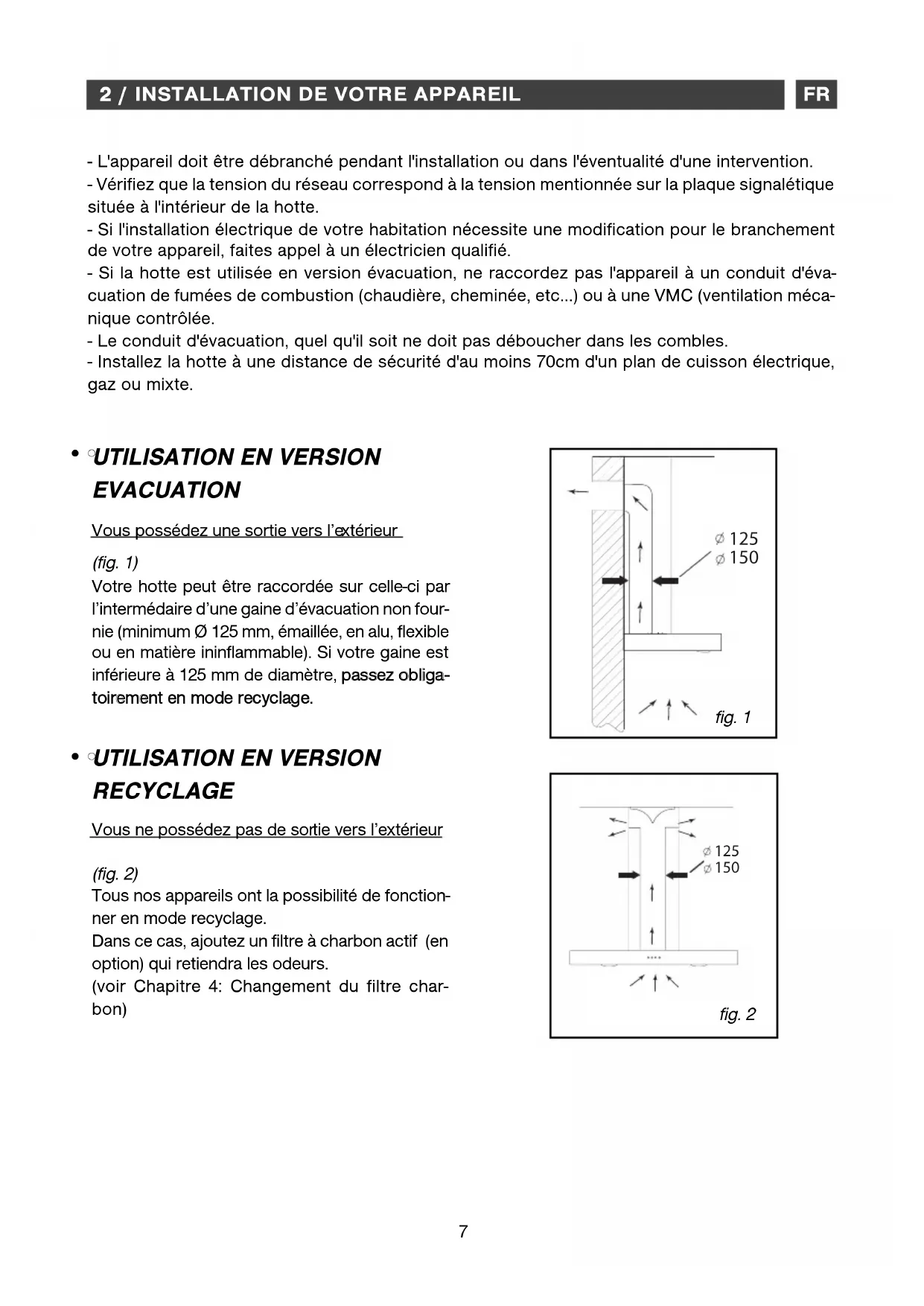 - L'appareil doit être débranché pendant l'installation ou dans l'éventualité d'une intervention.- Vérifiez que la tension du réseau correspond à la tension mentionnée sur la plaque signalétiquesituée à l'intérieur de la hotte. - Si l'installation électrique de votre habitation nécessite une modification pour le branchementde votre appareil, faites appel à un électricien qualifié.- Si la hotte est utilisée en version évacuation, ne raccordez pas l'appareil à un conduit d'éva-cuation de fumées de combustion (chaudière, cheminée, etc…) ou à une VMC (ventilation méca-nique contrôlée.- Le conduit d'évacuation, quel qu'il soit ne doit pas déboucher dans les combles.- Installez la hotte à une distance de sécurité d'au moins 70cm d'un plan de cuisson électrique,gaz ou mixte.
