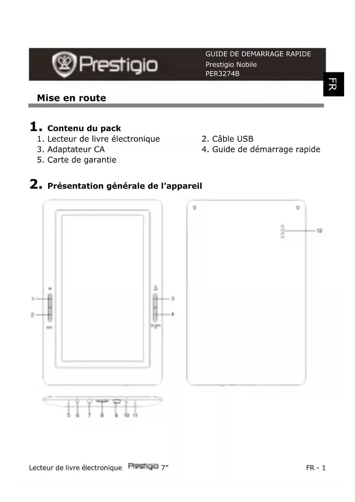GUIDE DE DEMARRAGE RAPIDE Prestigio Nobile PER3274B FRFR – 2 Lecteur de livre électronique 7”