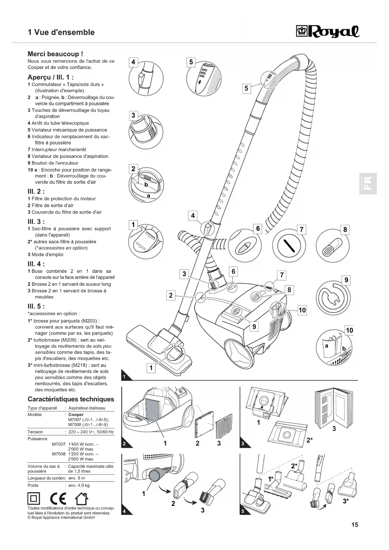Merci beaucoup !Nous vous remercions de l'achat de ceCooper et de votre confiance.Aperçu / Ill. 1 :1 Commutateur « Tapis/sols durs »(illustration d'exemple) 2a : Poignée, b : Déverrouillage du cou- vercle du compartiment à poussière3 Touches de déverrouillage du tuyau d'aspiration4 Arrêt du tube télescopique5 Variateur mécanique de puissance6 Indicateur de remplacement du sac-filtre à poussière7 Interrupteur marche/arrêt8 Variateur de puissance d'aspiration9 Bouton de l'enrouleur10 a : Encoche pour position de range-ment ; b : Déverrouillage du cou-vercle du filtre de sortie d'airIll. 2 :1 Filtre de protection du moteur2 Filtre de sortie d’air3 Couvercle du filtre de sortie d'airIll. 3 :1 Sac-filtre à poussière avec support(dans l'appareil)2* autres sacs-filtre à poussière (*accessoires en option)3 Mode d'emploiIll. 4 :1 Buse combinée 2 en 1 dans saconsole sur la face arrière de l'appareil2 Brosse 2 en 1 servant de suceur long3 Brosse 2 en 1 servant de brosse à meublesIll. 5 :*accessoires en option :1* brosse pour parquets (M203) :convient aux surfaces qu'il faut mé-nager (comme par ex. les parquets)2* turbobrosse (M209) : sert au net-toyage de revêtements de sols peu sensibles comme des tapis, des ta-pis d'escaliers, des moquettes etc.3* mini-turbobrosse (M219) : sert au nettoyage de revêtements de sols peu sensibles comme des objets rembourrés, des tapis d'escaliers, des moquettes etc.Caractéristiques techniques Toutes modifications d'ordre technique ou concep-
