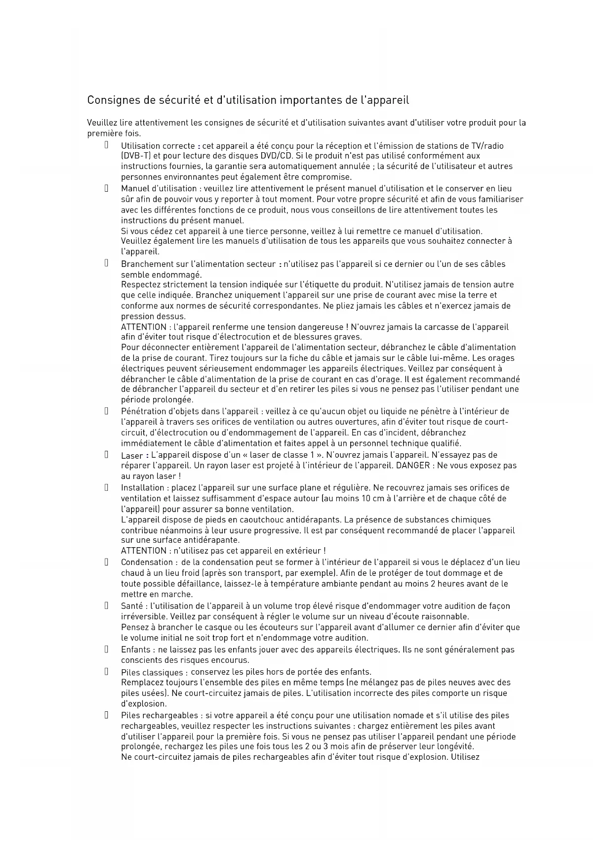 : cet appareil a été conçu pour la réception et l'émission de stations de TV/radio (DVB-T) et pour lecture des disques DVD/CD. Si le produit n'est pas utilisé conformément aux instructions fournies, la garantie sera automatiquement annulée ; la sécurité de l'utilisateur et autres personnes environnantes peut également être compromise.