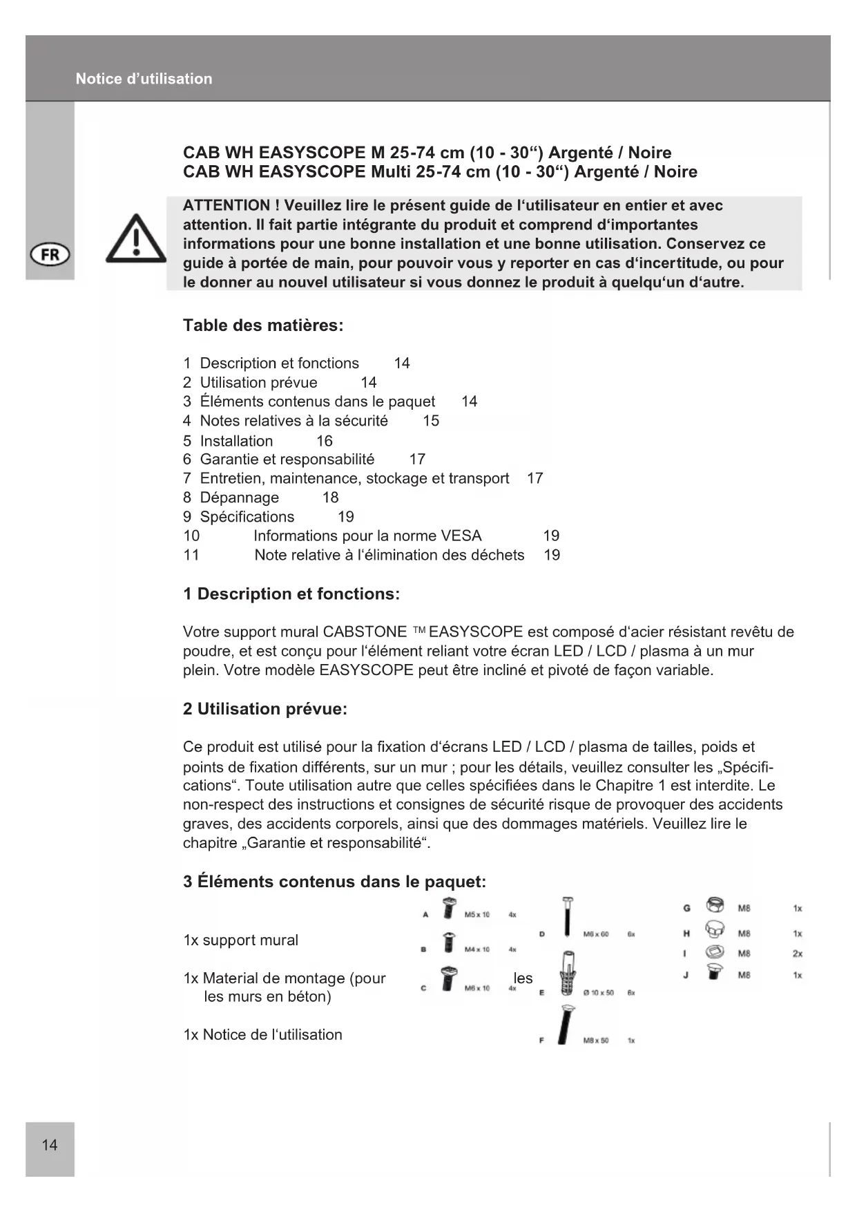 - Waste glass, plastic, waste metal, metal sheet, and more. This type of recycling of waste equipment contributes signicantly to the protection of our environment.14 Table des matières: 1 Description et fonctions 14 2 Utilisation prévue 14 3 Éléments contenus dans le paquet 14 4 Notes relatives à la sécurité 15 5 Installation 16 6 Garantie et responsabilité 17 7 Entretien, maintenance, stockage et transport 17 8 Dépannage 18 9 Spécications 19 10 Informations pour la norme VESA 19 11 Note relative à l‘élimination des déchets 19 ATTENTION ! Veuillez lire le présent guide de l‘utilisateur en entier et avec attention. Il fait partie intégrante du produit et comprend d‘importantes informations pour une bonne installation et une bonne utilisation. Conservez ce guide à portée de main, pour pouvoir vous y reporter en cas d‘incertitude, ou pour le donner au nouvel utilisateur si vous donnez le produit à quelqu‘un d‘autre. 1 Description et fonctions: Votre support mural CABSTONE