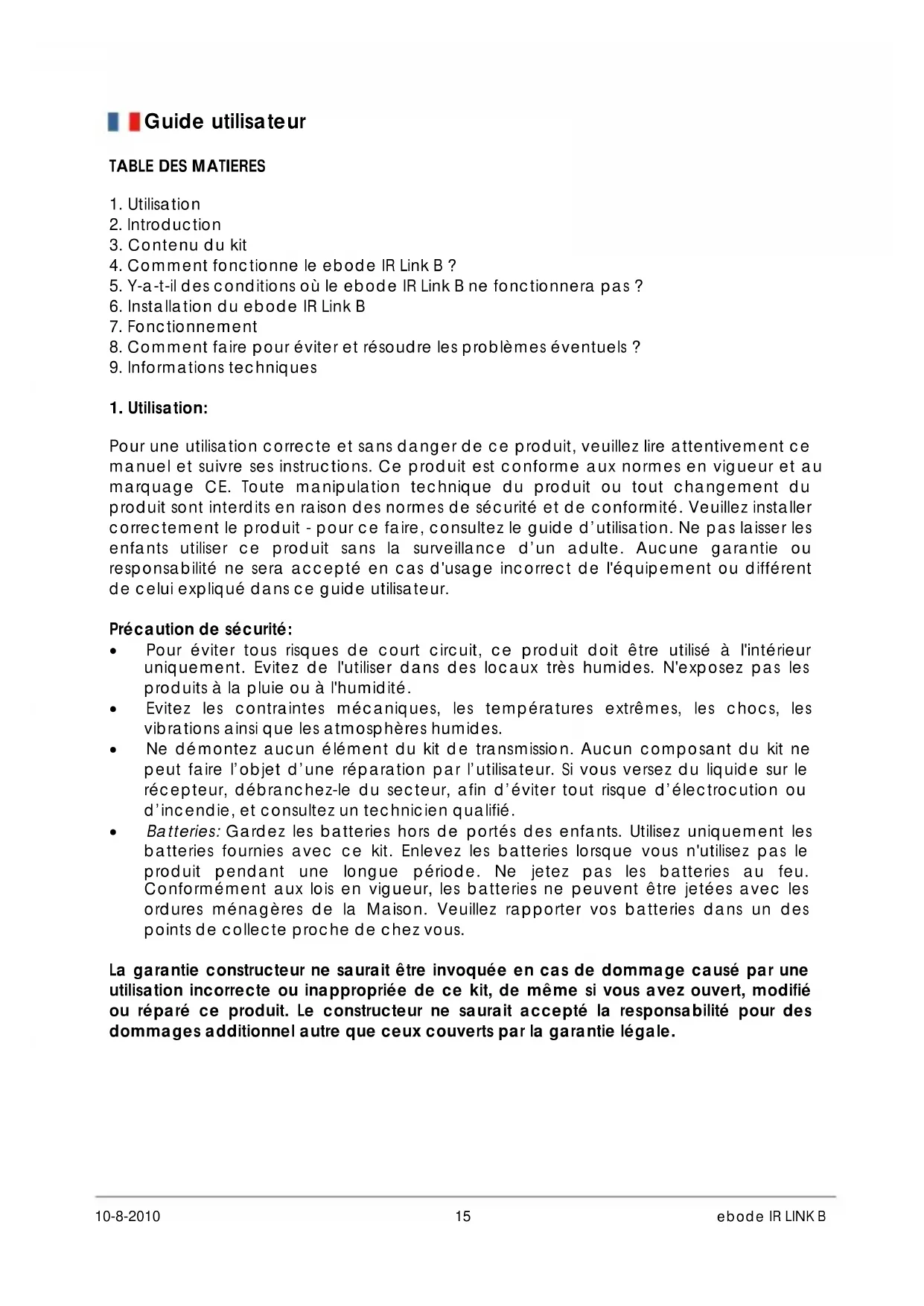 IR Link B - Télécommande EBODE - Notice d'utilisation et mode d'emploi gratuit