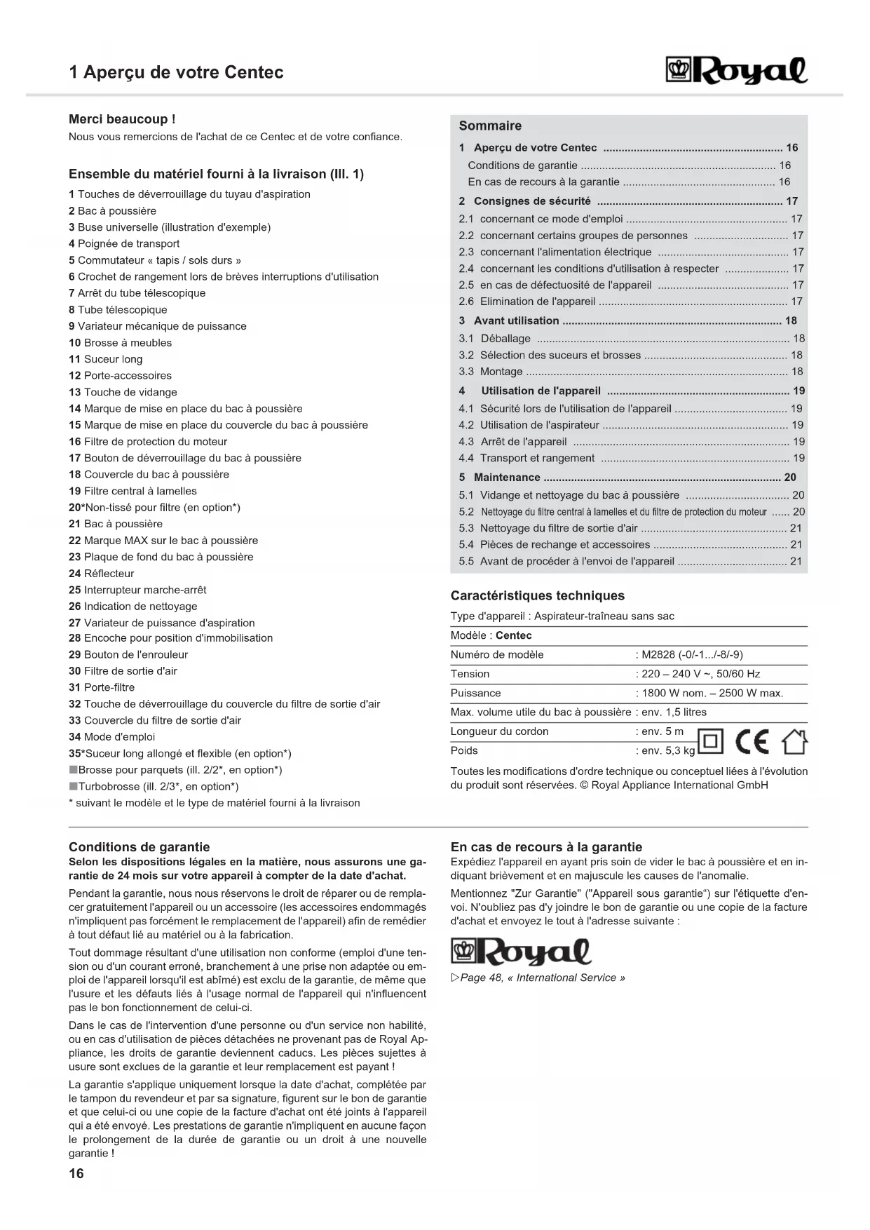 14 ATTENTION:L'élément du filtre de sortie d'air n'est pas lavable.ATTENTION:Utilisez seulement les pièces de rechange originales fournies à la livrai-son ou que vous avez commandées.No. d'art. Description2828001 Set de filtre de cinq éléments se composant d'un filtre central à lamelles, d'un filtre de protection du moteur, d'un filtre de sortie d'air et de deux non-tissé pour filtreM203 1 brosse pour parquetsM209 1 turbobrosseM232 1 suceur long allongé et flexibleAVERTISSEMENT:Risque de blessures ! N'utilisez jamais un appareil défectueux ! Avantde chercher la cause de l'anomalie, arrêtez l'appareil et retirez la fiche de la prise, ZChapitre 4.3, « Arrêt de l'appareil ». Problème Cause possible / solutionsImpossibi-lité de mettre en marche l'appareil.Il n'y pas de courant à la prise. Essayez de brancher l'aspi-rateur à une autre prise dont vous êtes sûr qu'elle fonctionne.Le cordon d'alimentation est endommagé. Faites remplacer le cordon par le service après-vente de Royal Appliance, adresse ZPage 48, « International Service ». L'appareil cesse soudain d'aspirer.La protection contre les surchauffes s'est déclenchée (certai-nement à cause d'une obturation des canaux d'aspiration ou pour une raison semblable).Éteignez l'appareil et débranchez-le. Éliminez la cause de la surchauffe (par exemple en démontant le tube télescopique et le tuyau d'aspiration pour en retirer ce qui cause l'obtura-tion). Attendez env. 45 minutes. Une fois l'appareil refroidi, vous pouvez le remettre en marche.L'indica-teur de nettoyage (ill. 1/25) s'allume.Le filtre central à lamelles est sale. Nettoyez le filtre central à lamelles, ZChapitre 5.2, « Nettoyage du filtre central à la- melles et du filtre de protection du moteur ».Le bac à poussière est trop plein. Videz/nettoyez le bac à poussière, ZChapitre 5.1, « Vidange et nettoyage du bac à poussière ».Le résultat de l'aspi-ration n'est pas satisfai-sant mal-gré un fonction-nement correct.Le variateur mécanique de puissance (ill. 1/9) est ouvert.Fermez le variateur mécanique de puissance.Le suceur ou la brosse mis en place n'est pas adéquat. Changez le suceur ou la brosse, Z Chapitre 3.2, « Sélection des suceurs et brosses ».La puissance d'aspiration réglée n'est pas adéquate.Adaptez la position du variateur de puissance d'aspiration au revêtement, ZChapitre 4.2, « Utilisation de l'aspirateur », étape 4.La position du commutateur « tapis /sols durs » (ill. 1/5) n'est pas adéquate. Adaptez la position du commutateur « tapis et moquettes / sols durs » au revêtement de sol, ZChapitre 4.2, « Utilisation de l'aspirateur », étape 5.Le bac à poussière est trop plein. Videz / nettoyez le bac à poussière, ZChapitre 5.1, « Vidan- ge et nettoyage du bac à poussière ».Les filtres sont encrassés. Nettoyez le filtre correspondant, ZChapitre 5.2, « Nettoyage du filtre central à lamelles et du filtre de protection du moteur » respectivement ZChapitre 5.3, « Nettoyage du filtre de sortie d'air ».Le suceur, le manche télescopique ou le flexible sont bou-chés. Débouchez-les. Si nécessaire, utilisez à cet effet un long morceau de bois (par ex. un manche à balai).REMARQUE:Prenez contact avec le service à la clientèle Royal si vous ne pouvez pas remédier vous-même à l'anomalie au moyen de ce tableau (ZPage 48, « International Service »).Problème Cause possible / solutions Centec.book Seite 21 Donnerstag, 21. April 2011 6:06 1848