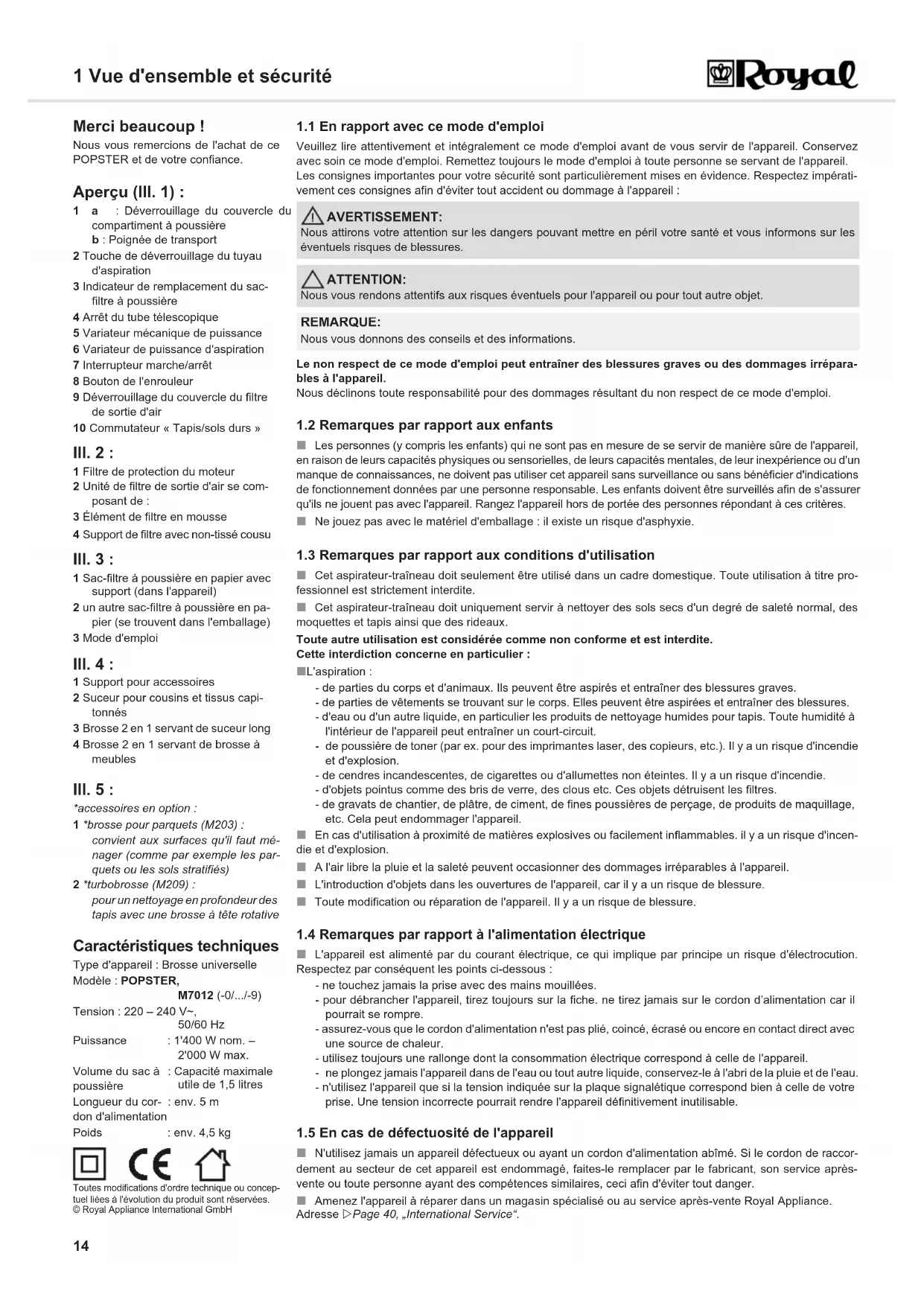 Nous vous donnons des conseils et des informations. Merci beaucoup ! Nous vous remercions de l'achat de cePOPSTER et de votre confiance. Aperçu (Ill. 1) : 1a : Déverrouillage du couvercle ducompartiment à poussièreb : Poignée de transport2 Touche de déverrouillage du tuyau d'aspiration3 Indicateur de remplacement du sac-filtre à poussière4 Arrêt du tube télescopique5 Variateur mécanique de puissance6 Variateur de puissance d'aspiration7 Interrupteur marche/arrêt8 Bouton de l'enrouleur9 Déverrouillage du couvercle du filtre de sortie d'air10 Commutateur « Tapis/sols durs » Ill. 2 : 1 Filtre de protection du moteur2 Unité de filtre de sortie d'air se com-posant de :3 Élément de filtre en mousse4 Support de filtre avec non-tissé cousu Ill. 3 : 1 Sac-filtre à poussière en papier avecsupport (dans l'appareil)2 un autre sac-filtre à poussière en pa-pier (se trouvent dans l'emballage)3 Mode d'emploi Ill. 4 : 1 Support pour accessoires2 Suceur pour cousins et tissus capi-tonnés3 Brosse 2 en 1 servant de suceur long4 Brosse 2 en 1 servant de brosse à meubles Ill. 5 : *accessoires en option :1 *brosse pour parquets (M203) :convient aux surfaces qu'il faut mé-nager (comme par exemple les par-quets ou les sols stratifiés)2 *turbobrosse (M209) :pour un nettoyage en profondeur des tapis avec une brosse à tête rotative Caractéristiques techniques Toutes modifications d'ordre technique ou concep-tuel liées à l'évolution du produit sont réservées. © Royal Appliance International GmbHType d'appareil : Brosse universelleModèle : POPSTER, M7012 (-0/.../-9)Tension : 220 – 240 V~, 50/60 HzPuissance : 1'400 W nom. – 2'000 W max.Volume du sac à poussière : Capacité maximale utile de 1,5 litresLongueur du cor-don d'alimentation: env. 5 mPoids : env. 4,5 kg POPSTER.book Seite 14 Freitag, 6. Mai 2011 1:32 1315