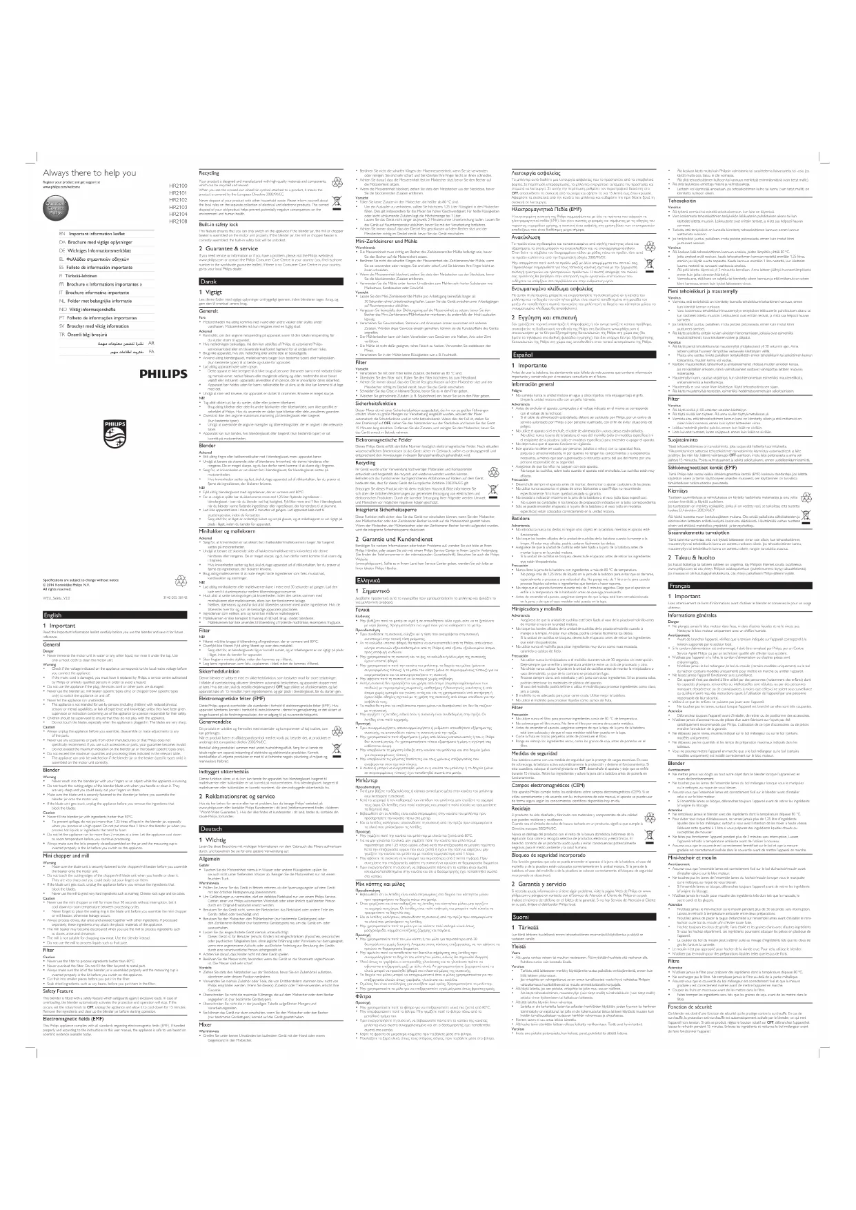 1 Important Lisez attentivement ce livret d’informations avant d’utiliser le blender et conservez-le pour un usage ultérieur. Informations générales Danger• Ne plongez jamais le bloc moteur dans l’eau, ni dans d’autres liquides et ne le rincez pas. Nettoyez le bloc moteur uniquement avec un chiffon humide.Avertissement • Avant de brancher l’appareil, vériez que la tension indiquée sur l’appareil correspond à la tension supportée par le secteur local.• Si le cordon d’alimentation est endommagé, il doit être remplacé par Philips, par un Centre Service Agréé Philips ou par un technicien qualié an d’éviter tout accident.• N’utilisez pas l’appareil si la che, le cordon d’alimentation ou d’autres pièces sont endommagées. • N’utilisez jamais le bol mélangeur, le bol du moulin (certains modèles uniquement) ou le bol du hachoir (certains modèles uniquement) pour mettre en marche ou arrêter l’appareil.• Ne laissez jamais l’appareil fonctionner sans surveillance. • Cet appareil n’est pas destiné à être utilisé par des personnes (notamment des enfants) dont les capacités physiques, sensorielles ou intellectuelles sont réduites, ou par des personnes manquant d’expérience ou de connaissances, à moins que celles-ci ne soient sous surveillance ou qu’elles n’aient reçu des instructions quant à l’utilisation de l’appareil par une personne responsable de leur sécurité.• Veillez à ce que les enfants ne puissent pas jouer avec l’appareil. • Ne touchez pas les lames, surtout lorsque l’appareil est branché car elles sont très coupantes. Attention • Débranchez toujours l’appareil avant d’installer, de retirer ou de positionner des accessoires. • N’utilisez jamais d’accessoires ou de pièces d’un autre fabricant ou n’ayant pas été spéciquement recommandés par Philips. L’utilisation de ce type d’accessoires ou de pièces entraîne l’annulation de la garantie.• Ne dépassez pas le niveau maximal indiqué sur le bol mélangeur ou sur le bol (certains modèles uniquement).• Ne dépassez pas les quantités et les temps de préparation maximaux indiqués dans les tableaux.• Vous ne pourrez mettre l’appareil en marche que si le bol mélangeur ou le bol (certains modèles uniquement) est installé correctement sur le bloc moteur. Blender Avertissement• Ne mettez jamais vos doigts ou tout autre objet dans le blender lorsque l’appareil est en cours de fonctionnement.• Ne touchez pas les lames de l’ensemble lames du bol mélangeur lorsque vous le manipulez ou le nettoyez, au risque de vous blesser. • Assurez-vous que l’ensemble lames est correctement xé sur le blender avant d’installer celui-ci sur le bloc moteur. • Si l’ensemble lames se bloque, débranchez toujours l’appareil avant de retirer les ingrédients à l’origine du blocage.Attention• Ne remplissez jamais le blender avec des ingrédients dont la température dépasse 80 °C.• Pour éviter tout risque d’éclaboussure, ne versez jamais plus de 1,25 litre d’ingrédients liquides dans le bol mélangeur, surtout si vous avez l’intention de les mixer à haute vitesse. Réduisez cette quantité à 1 litre si vous préparez des ingrédients liquides chauds ou susceptibles de mousser.• Ne faites pas fonctionner l’appareil pendant plus de 2 minutes sans interruption. Laissez l’appareil refroidir à température ambiante avant de l’utiliser à nouveau.• Assurez-vous que le couvercle est correctement fermé/xé sur le bol et que la mesure graduée est correctement insérée dans le couvercle avant de mettre l’appareil en marche. Mini-hachoir et moulin Avertissement• Assurez-vous que l’ensemble lames est correctement xé sur le bol du hachoir/moulin avant d’installer celui-ci sur le bloc moteur.• Ne touchez pas les lames de l’ensemble lames du hachoir/moulin lorsque vous le manipulez ou le nettoyez, au risque de vous blesser. • Si l’ensemble lames se bloque, débranchez toujours l’appareil avant de retirer les ingrédients à l’origine du blocage.• N’utilisez jamais le moulin pour moudre des ingrédients très durs tels que la muscade, le sucre candi et les glaçons.Attention • N’utilisez jamais le mini-hachoir ou le moulin pendant plus de 30 secondes sans interruption. Laissez-le refroidir à température ambiante entre deux préparations. • N’oubliez jamais de placer la bague d’étanchéité sur l’ensemble lames avant d’installer le mini- hachoir ou le bol du moulin an d’éviter toute fuite. • Hachez toujours les clous de giroe, l’anis étoilé et les graines d’anis avec d’autres ingrédients. Si vous les hachez séparément, ces ingrédients pourraient attaquer les pièces en plastique de l’appareil. • La couleur du bol du moulin peut s’altérer suite au mixage d’ingrédients tels que les clous de giroe, l’anis et la cannelle.• Le moulin n’est pas approprié pour hacher de la viande crue. Pour cela, utilisez le blender.• N’utilisez pas le moulin pour des préparations liquides telles que les jus de fruits. Filtre Attention• N’utilisez jamais le ltre pour préparer des ingrédients dont la température dépasse 80 °C.• Ne surchargez pas le ltre. Ne remplissez jamais le ltre au-delà de la partie métallique.• Assurez-vous que le couvercle du bol mélangeur est correctement xé et que la mesure graduée y est correctement insérée avant de mettre l’appareil en marche.• Coupez les fruits en morceaux avant de les mettre dans le ltre. • Faites tremper les ingrédients secs, tels que les graines de soja, avant de les mettre dans le ltre. Fonction de sécurité Ce blender est doté d’une fonction de sécurité qui le protège contre la surchauffe. En cas de surchauffe, la protection anti-surchauffe est automatiquement activée par le blender, ce qui met l’appareil hors tension. Si cela se produit, réglez le bouton rotat