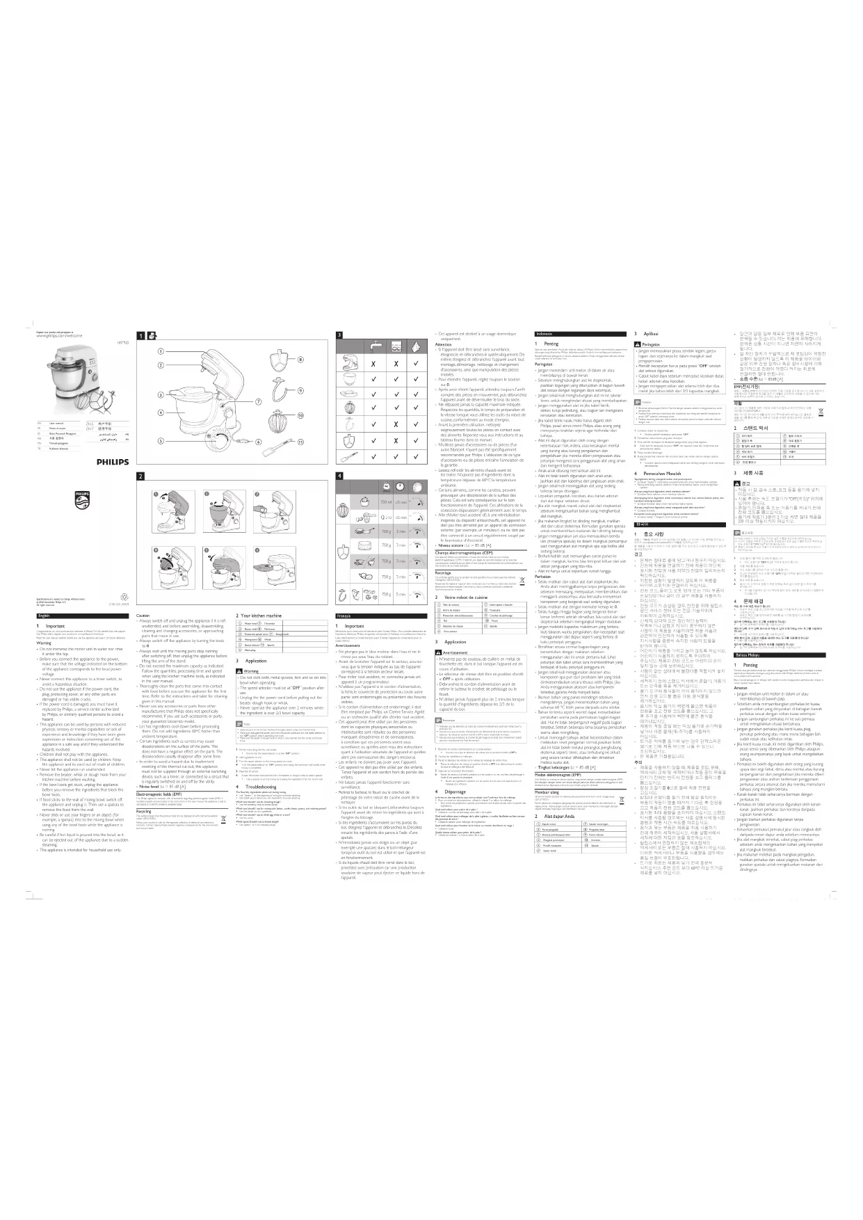 - Use a spatula to aid the mixing by scraping the ingredients from the bowl’s wall. 4 Troubleshooting The our/dry ingredients splash out during mixing• Use “Speed 1” at the beginning of mixing to minimize splashing. • Add splash guard before you add ingredients to avoid splashing.Which tool should I use for kneading dough?• Use the kneading hook to knead dough.Which tool should I use for mixing cake batter, cookie batter, pastry, and mashing potato?• Use the beater to mix ingredients.Which tool should I use to whisk egg white or cream?• Use the whisk.Which speed should I use to knead dough?• Use Speed 1 to 4 for kneading dough.Français 1 Important Félicitations pour votre achat et bienvenue dans l'univers Philips ! Pour proter pleinement de l'assistance offerte par Philips, enregistrez votre produit à l'adresse www.philips.com/welcome.Lisez attentivement ce mode d'emploi avant d'utiliser l'appareil et conservez-le pour un usage ultérieur.Avertissement• Ne plongez pas le bloc moteur dans l’eau et ne le rincez pas sous l’eau du robinet.• Avant de brancher l’appareil sur le secteur, assurez-vous que la tension indiquée au bas de l’appareil correspond à la tension secteur locale.• Pour éviter tout accident, ne connectez jamais cet appareil à un programmateur.• N'utilisez pas l'appareil si le cordon d'alimentation, la che, le couvercle de protection ou toute autre partie sont endommagés ou présentent des ssures visibles.• Si le cordon d’alimentation est endommagé, il doit être remplacé par Philips, un Centre Service Agréé ou un technicien qualié an d’éviter tout accident.• Cet appareil peut être utilisé par des personnes dont les capacités physiques, sensorielles ou intellectuelles sont réduites ou des personnes manquant d’expérience et de connaissances, à condition que ces personnes soient sous surveillance ou qu’elles aient reçu des instructions quant à l’utilisation sécurisée de l’appareil et qu’elles aient pris connaissance des dangers encourus.• Les enfants ne doivent pas jouer avec l’appareil.• Cet appareil ne doit pas être utilisé par des enfants. Tenez l’appareil et son cordon hors de portée des enfants.• Ne laissez jamais l’appareil fonctionner sans surveillance.• Retirez le batteur, le fouet ou le crochet de pétrissage de votre robot de cuisine avant de le nettoyer.• Si les outils du bol se bloquent, débranchez toujours l'appareil avant de retirer les ingrédients qui sont à l'origine du blocage.• Si des ingrédients s'accumulent sur les parois du bol, éteignez l'appareil et débranchez-le. Décollez ensuite les ingrédients des parois à l'aide d'une spatule.• N’introduisez jamais vos doigts ou un objet (par exemple une spatule) dans le bol mélangeur lorsqu’un outil du bol est utilisé et que l’appareil est en fonctionnement.• Si du liquide chaud doit être versé dans le bol, procédez avec précaution car une production soudaine de vapeur peut éjecter ce liquide hors de l’appareil.EN User manualFR Mode d’emploiID Buku Petunjuk PenggunaKO 사용 설명서MS Manual penggunaTR Kullanım kılavuzuZH-S 用户手册ZH-T 使用手冊 AR FA3140 035 34704• Cet appareil est destiné à un usage domestique uniquement.Attention• Si l'appareil doit être laissé sans surveillance, éteignez-le et débranchez-le systématiquement. De même, éteignez et débranchez l'appareil avant tout montage, démontage, nettoyage et changement d'accessoires, ainsi que manipulation des pièces mobiles.• Pour éteindre l'appareil, réglez toujours le bouton sur 0.• Après avoir éteint l'appareil, attendez toujours l'arrêt complet des pièces en mouvement, puis débranchez l'appareil avant de déverrouiller le bras du socle.• Ne dépassez jamais la capacité maximale indiquée. Respectez les quantités, le temps de préparation et la vitesse lorsque vous utilisez les outils du robot de cuisine, conformément au mode d'emploi.• Avant la première utilisation, nettoyez soigneusement toutes les pièces en contact avec des aliments. Reportez-vous aux instructions et au tableau fournis dans ce manuel.• N'utilisez jamais d'accessoires ou de pièces d'un autre fabricant n'ayant pas été spéciquement recommandés par Philips. L'utilisation de ce type d'accessoires ou de pièces entraîne l'annulation de la garantie.• Laissez refroidir les aliments chauds avant de les traiter. N'ajoutez pas d'ingrédients dont la température dépasse de 60°C la température ambiante.• Certains aliments, comme les carottes, peuvent provoquer une décoloration de la surface des pièces. Cela est sans conséquence sur le bon fonctionnement de l'appareil. Ces altérations de la coloration disparaissent généralement avec le temps.• An d'éviter tout accident dû à une réinitialisation inopinée du dispositif antisurchauffe, cet appareil ne doit pas être alimenté par un appareil de connexion externe (par exemple, un minuteur) ou ne doit pas être connecté à un circuit régulièrement coupé par le fournisseur d'électricité.• Niveau sonore : Lc = 85 dB [A].Champs électromagnétiques (CEM)Cet appareil Philips est conforme à toutes les normes relatives aux champs électromagnétiques (CEM). Il répond aux règles de sécurité établies sur la base des connaissances scientiques actuelles s'il est manipulé correctement et conformément aux instructions de ce mode d'emploi.Recyclage Ce symbole signie que ce produit ne doit pas être mis au rebut avec les ordures ménagères (2012/19/UE).Respectez les règles en vigueur dans votre pays pour la mise au rebut des produits électriques et électroniques. Une mise au rebut correcte contribue à préserver l'environnement et la santé. 2 Votre robot de cuisine a Tête du moteur g Interrupteur à bascule b Arbre du batteur h Fouet plat c Protection anti-éclaboussures i Crochet de pétrissage d Bol j Fouet e Sélecteur de vitesse k Spatule f Pr
