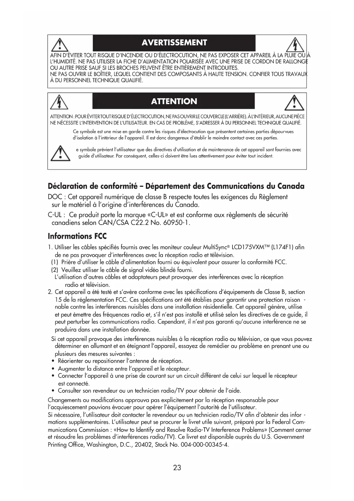 LCD195VX+(L194F2) are in compliance with Council Directive 73/23/EEC: – EN 60950-1 Council Directive 89/336/EEC: – EN 55022 – EN 61000-3-2 – EN 61000-3-3 – EN 55024 and marked with NEC Display Solutions, Ltd. 4-13-23, Shibaura, Minato-Ku Tokyo 108-0023, Japan23 AFIN D’ÉVITER TOUT RISQUE D’INCENDIE OU D’ÉLECTROCUTION, NE PAS EXPOSER CET APPAREIL À LA PLUIE OU À L’HUMIDITÉ. NE PAS UTILISER LA FICHE D’ALIMENTATION POLARISÉE AVEC UNE PRISE DE CORDON DE RALLONGE OU AUTRE PRISE SAUF SI LES BROCHES PEUVENT ÊTRE ENTIÈREMENT INTRODUITES. NE PAS OUVRIR LE BOÎTIER, LEQUEL CONTIENT DES COMPOSANTS À HAUTE TENSION. CONFIER TOUS TRAVAUX À DU PERSONNEL TECHNIQUE QUALIFIÉ. AVERTISSEMENT ATTENTION ATTENTION : POUR ÉVITER TOUT RISQUE D’ÉLECTROCUTION, NE PAS OUVRIR LE COUVERCLE (L’ARRIÈRE). À L’INTÉRIEUR, AUCUNE PIÈCE NE NÉCESSITE L’INTERVENTION DE L’UTILISATEUR. EN CAS DE PROBLÈME, S’ADRESSER À DU PERSONNEL TECHNIQUE QUALIFIÉ. Ce symbole est une mise en garde contre les risques d’électrocution que présentent certaines parties dépourvues d’isolation à l’intérieur de l’appareil. Il est donc dangereux d’établir le moindre contact avec ces parties