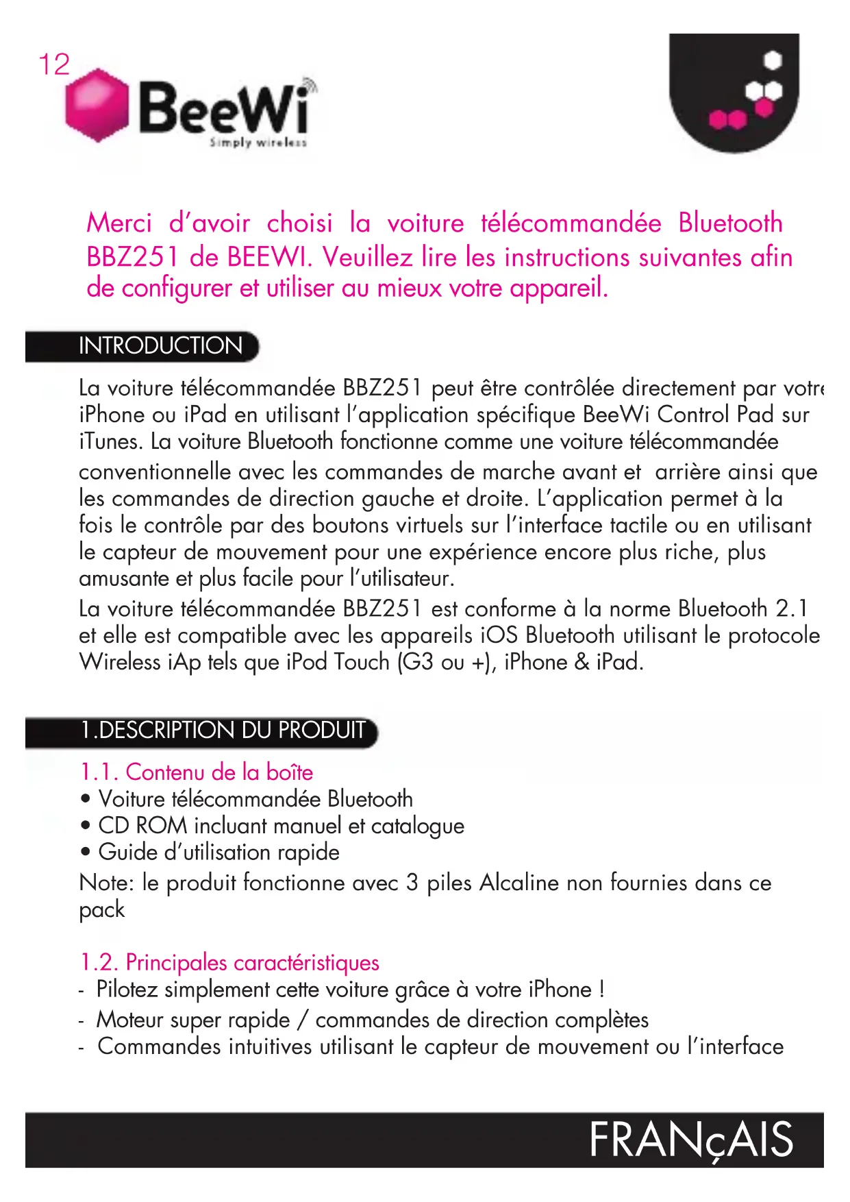 - Guide d’utilisation rapide Note: le produit fonctionne avec 3 piles Alcaline non fournies dans ce pack 1.2. Principales caractéristiques - Pilotez simplement cette voiture grâce à votre iPhone ! - Moteur super rapide / commandes de direction complètes - Commandes intuitives utilisant le capteur de mouvement ou l’interface Merci d’avoir choisi la voiture télécommandée Bluetooth BBZ251 de BEEWI. Veuillez lire les instructions suivantes afin de configurer et utiliser au mieux votre appareil. INTRODUCTION