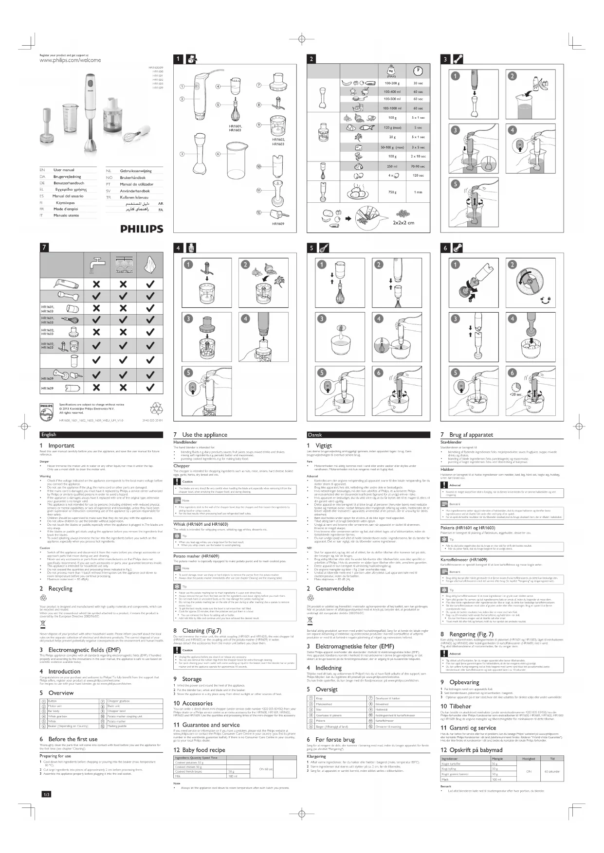 • Pour un nettoyage rapide, versez de l'eau chaude savonneuse dans le bol, insérez le pied plongeant du blender ou la barre pour pomme de terre et faites fonctionner l'appareil pendant environ 10 secondes. 9 Rangement 1 Enroulez le cordon autour du socle de l'appareil.2 Mettez le mixeur plongeant, le fouet et l'ensemble des lames dans le bol. 3 Rangezl'appareildansunendroitsecàl'abridelalumièredirectedusoleiloud'autressources de chaleur. 10 Accessoires Vouspouvezcommanderlemini-hachoiràentraînementdirect(coden°420303583450)entantqu'accessoire supplémentaire pour les appareils HR1600, HR1601, HR1602, HR1603 et HR1609 auprèsdevotrerevendeurPhilipsouauprèsd'unCentreServiceAgrééPhilips.Suivezlesquantitéset les temps de préparation relatifs au mini-hachoir lorsque vous utilisez cet accessoire. 11 Garantie et service Si vous souhaitez obtenir des informations supplémentaires ou si vous rencontrez unproblème,visitezlesiteWebdePhilipsàl'adressewww.philips.comoucontactezle Service Consommateurs Philips de votre pays (vous trouverez le numéro de téléphone correspondant dans le dépliant de garantie internationale). S'il n'y a pas de CentreServiceConsommateursdansvotrepays,adressez-vousàvotrerevendeurPhilips. 12 Recette pour bébés Ingrédients Quantité Vitesse TempsPommes de terre cuites 50 g ACTIVÉ 60 sPoulet cuit 50 gHaricots verts cuits 50 gLait 100 mlRemarque• Laisseztoujoursl'appareilrefroidiraprèsavoirpréparéuneportion. Italiano