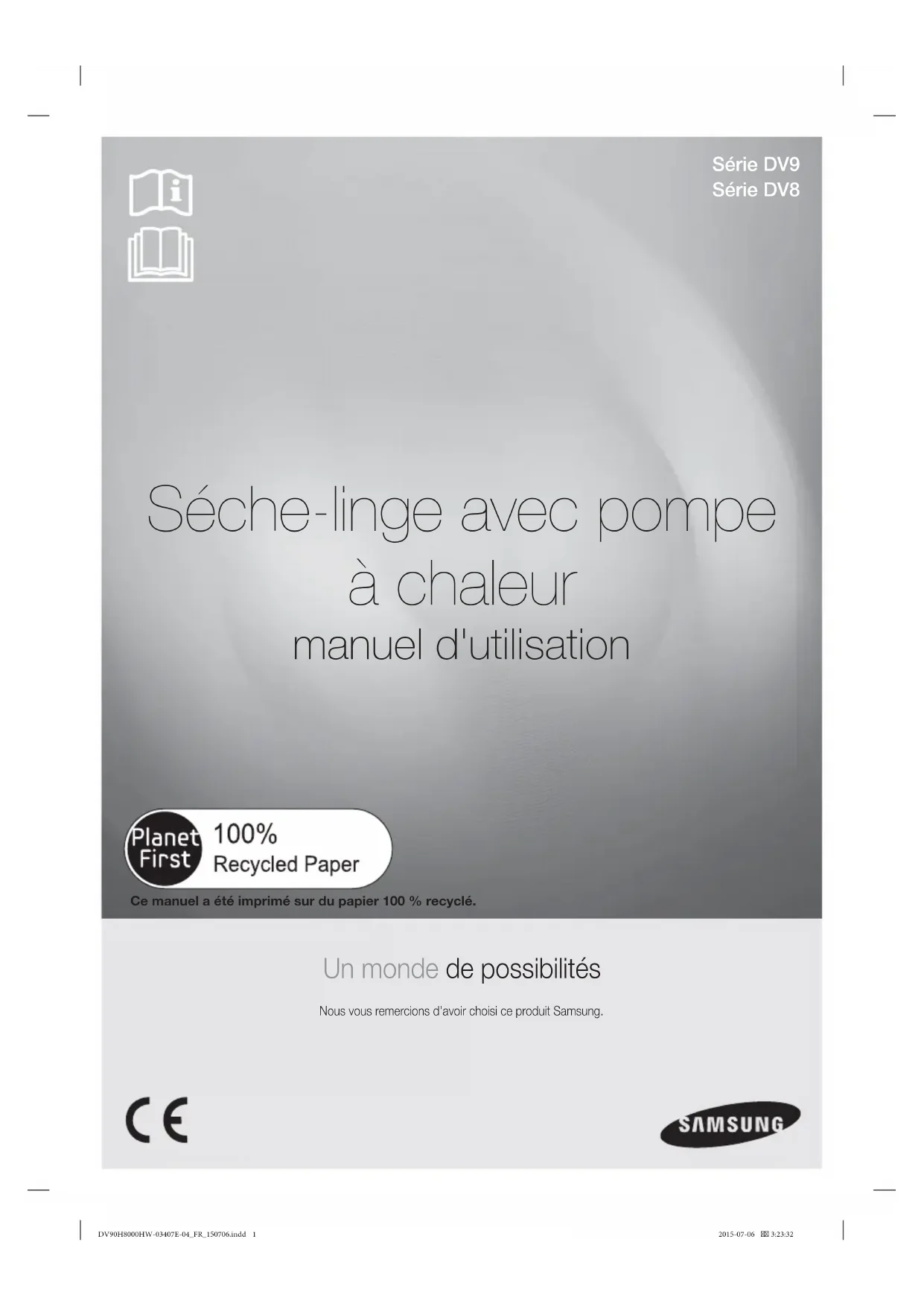 de faire preuve de bon sens, de prudence et de discernement lors de l’installation, de l’entretien et de l’utilisation de votre sèche-linge. Contactez toujours le fabricant en cas de problème ou de situation que vous ne comprenez pas. SYMBOLES ET MESURES DE SÉCURITÉ IMPORTANTS AVERTISSEMENTRisques ou pratiques inadaptées susceptibles de causer de graves blessures ou la mort.ATTENTIONRisques ou pratiques inadaptées susceptibles de causer des blessures moins importantes ou des dommages matériels.ATTENTIONPour réduire le risque d'incendie, d'explosion, d'électrocution ou de blessure lors de l'utilisation de votre sèche-linge, observez les consignes élémentaires de sécurité suivantes:NE PAS faire.NE PAS démonter.NE PAS toucher.Suivez scrupuleusement les consignes.Débrancher la prise murale.S'assurer que l'appareil est relié à la terre afi n d'éviter tout choc électrique.Contacter le service d'assistance technique pour obtenir de l'aide.RemarqueLisez le manuel d’utilisation.Ces icônes d'avertissement ont pour but d'éviter tout risque de blessure corporelle. Respectez-les en toutes circonstances. Lisez attentivement la section Consignes de sécurité de ce manuel et conservez ce dernier en lieu sûr afi n de pouvoir le consulter ultérieurement.Lisez attentivement toutes les consignes avant d'utiliser l'appareil. DV90H8000HW-03407E-04_FR_150706.indd Sec1:4DV90H8000HW-03407E-04_FR_150706.indd Sec1:4 2015-07-06 3:23:352015-07-06 3:23:35Français - 5