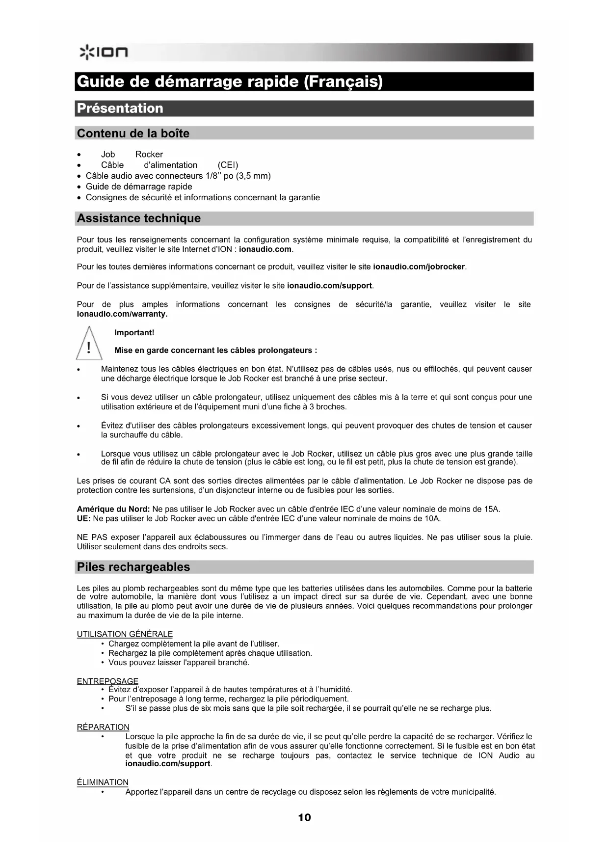 - Job Rocker • Câble d'alimentation (CEI) • Câble audio avec connecteurs 1/8’’ po (3,5 mm) • Guide de démarrage rapide • Consignes de sécurité et informations concernant la garantie Assistance technique Pour tous les renseignements concernant la configuration système minimale requise, la compatibilité et l’enregistrement du produit, veuillez visiter le site Internet d’ION : ionaudio.com. Pour les toutes dernières informations concernant ce produit, veuillez visiter le site ionaudio.com/jobrocker. Pour de l’assistance supplémentaire, veuillez visiter le site ionaudio.com/support. Pour de plus amples informations concernant les consignes de sécurité/la garantie, veuillez visiter le site ionaudio.com/warranty. Important! Mise en garde concernant les câbles prolongateurs :