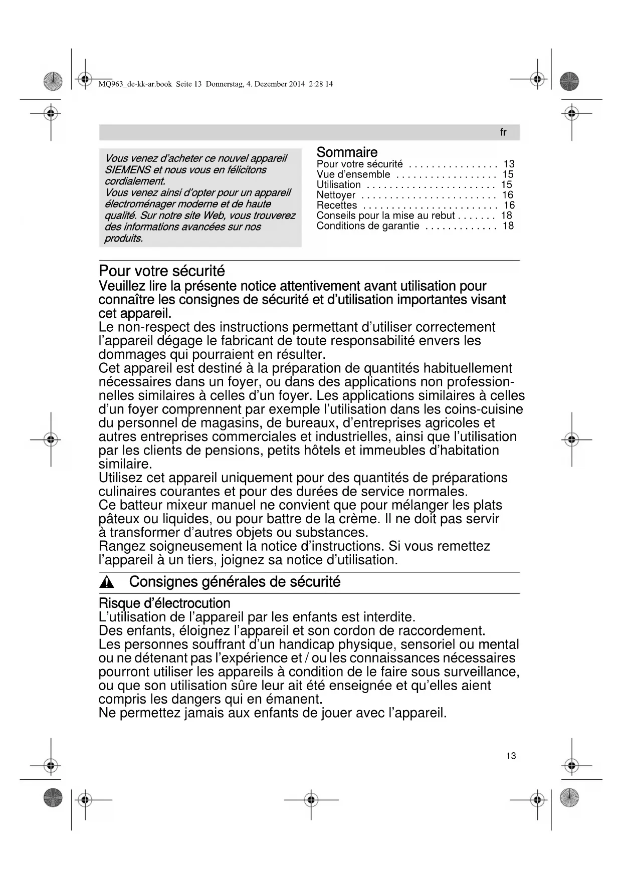 Retrouvez gratuitement la notice de l'appareil MQ96300 SIEMENS au format PDF.