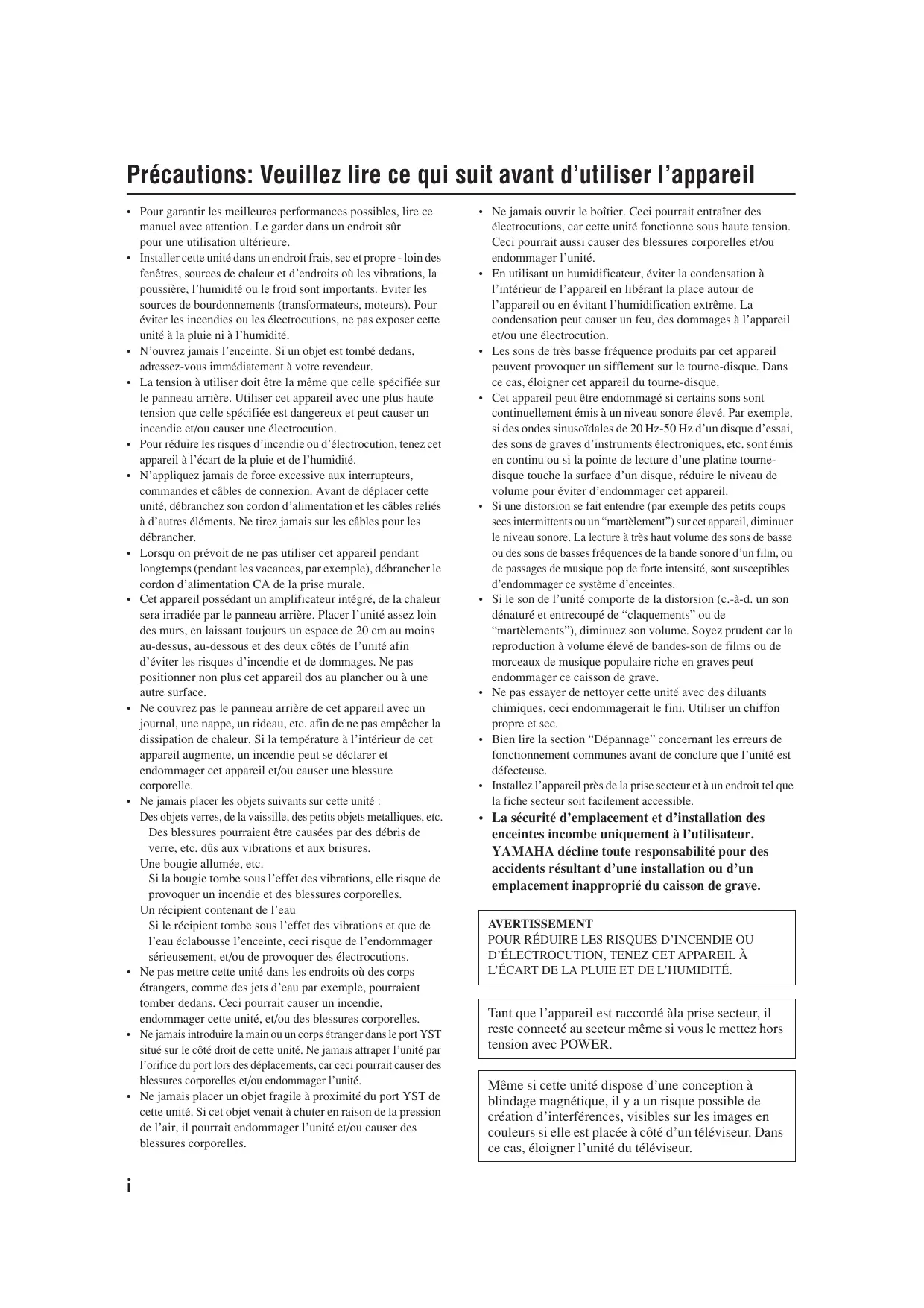 YAMAHA décline toute responsabilité pour des accidents résultant d’une installation ou d’un emplacement inapproprié du caisson de grave. AVERTISSEMENT POUR RÉDUIRE LES RISQUES D’INCENDIE OU D’ÉLECTROCUTION, TENEZ CET APPAREIL À L’ÉCART DE LA PLUIE ET DE L’HUMIDITÉ.