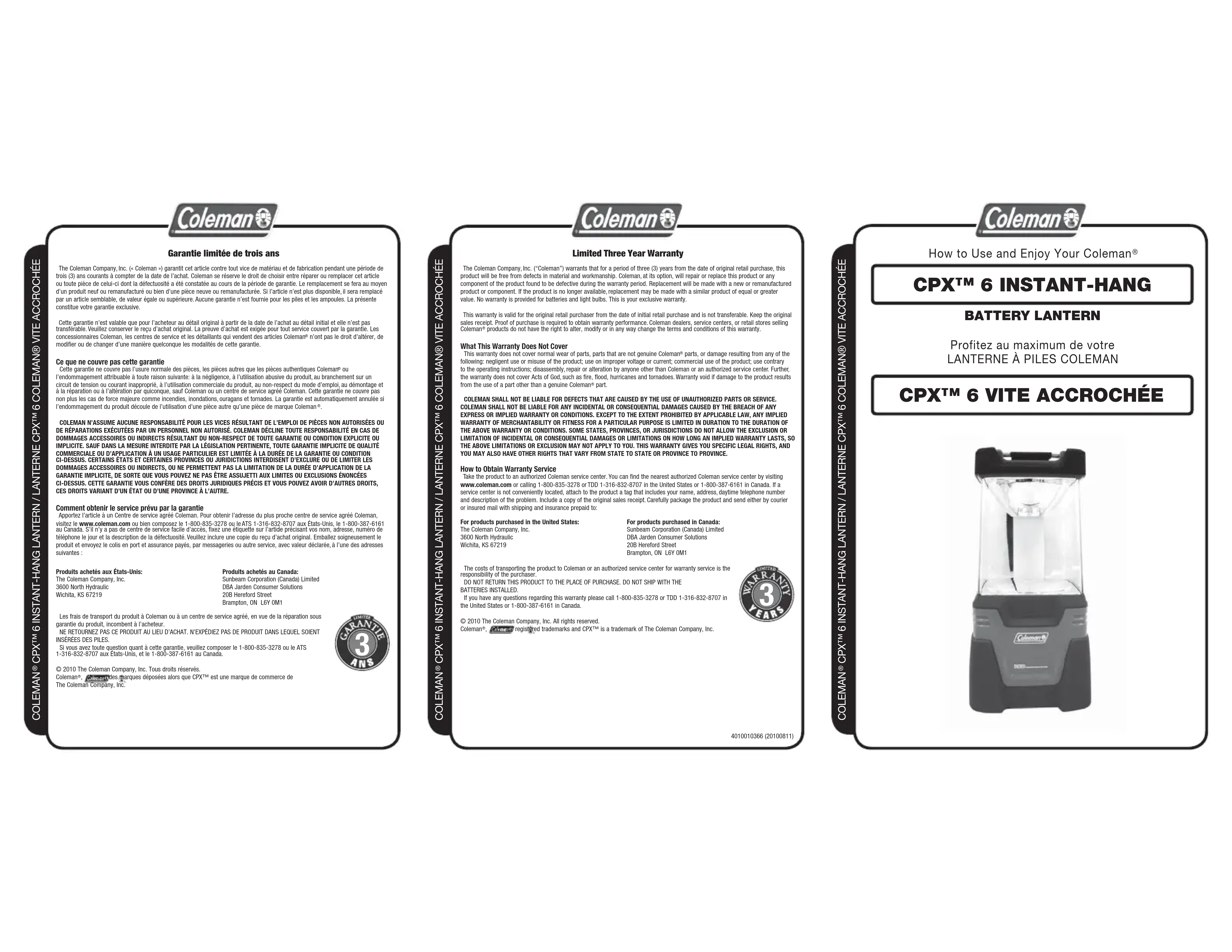 Les frais de transport du produit à Coleman ou à un centre de service agréé, en vue de la réparation sous garantie du produit, incombent à l’acheteur. NE RETOURNEZ PAS CE PRODUIT AU LIEU D’ACHAT. N’EXPÉDIEZ PAS DE PRODUIT DANS LEQUEL SOIENT INSÉRÉES DES PILES. Si vous avez toute question quant à cette garantie, veuillez composer le 1-800-835-3278 ou le ATS 1-316-832-8707 aux États-Unis, et le 1-800-387-6161 au Canada.© 2010 The Coleman Company, Inc. Tous droits réservés.Coleman , et sont des marques déposées alors que CPX™ est une marque de commerce de The Coleman Company, Inc. The costs of transporting the product to Coleman or an authorized service center for warranty service is the responsibility of the purchaser. DO NOT RETURN THIS PRODUCT TO THE PLACE OF PURCHASE. DO NOT SHIP WITH THE BATTERIES INSTALLED. If you have any questions regarding this warranty please call 1-800-835-3278 or TDD 1-316-832-8707 in the United States or 1-800-387-6161 in Canada.© 2010 The Coleman Company, Inc. All rights reserved.Coleman , and are registered trademarks and CPX™ is a trademark of The Coleman Company, Inc.Garantie limitée de trois ans The Coleman Company, Inc. (« Coleman ») garantit cet article contre tout vice de matériau et de fabrication pendant une période de trois (3) ans courants à compter de la date de l’achat. Coleman se réserve le droit de choisir entre réparer ou remplacer cet article ou toute pièce de celui-ci dont la défectuosité a été constatée au cours de la période de garantie. Le remplacement se fera au moyen d’un produit neuf ou remanufacturé ou bien d’une pièce neuve ou remanufacturée. Si l’article n’est plus disponible, il sera remplacé par un article semblable, de valeur égale ou supérieure. Aucune garantie n’est fournie pour les piles et les ampoules. La présente constitue votre garantie exclusive. Cette garantie n’est valable que pour l’acheteur au détail original à partir de la date de l’achat au détail initial et elle n’est pas transférable. Veuillez conserver le reçu d’achat original. La preuve d’achat est exigée pour tout service couvert par la garantie. Les concessionnaires Coleman, les centres de service et les détaillants qui vendent des articles Coleman n’ont pas le droit d’altérer, de modifier ou de changer d’une manière quelconque les modalités de cette garantie.Ce que ne couvre pas cette garantie Cette garantie ne couvre pas l’usure normale des pièces, les pièces autres que les pièces authentiques Coleman