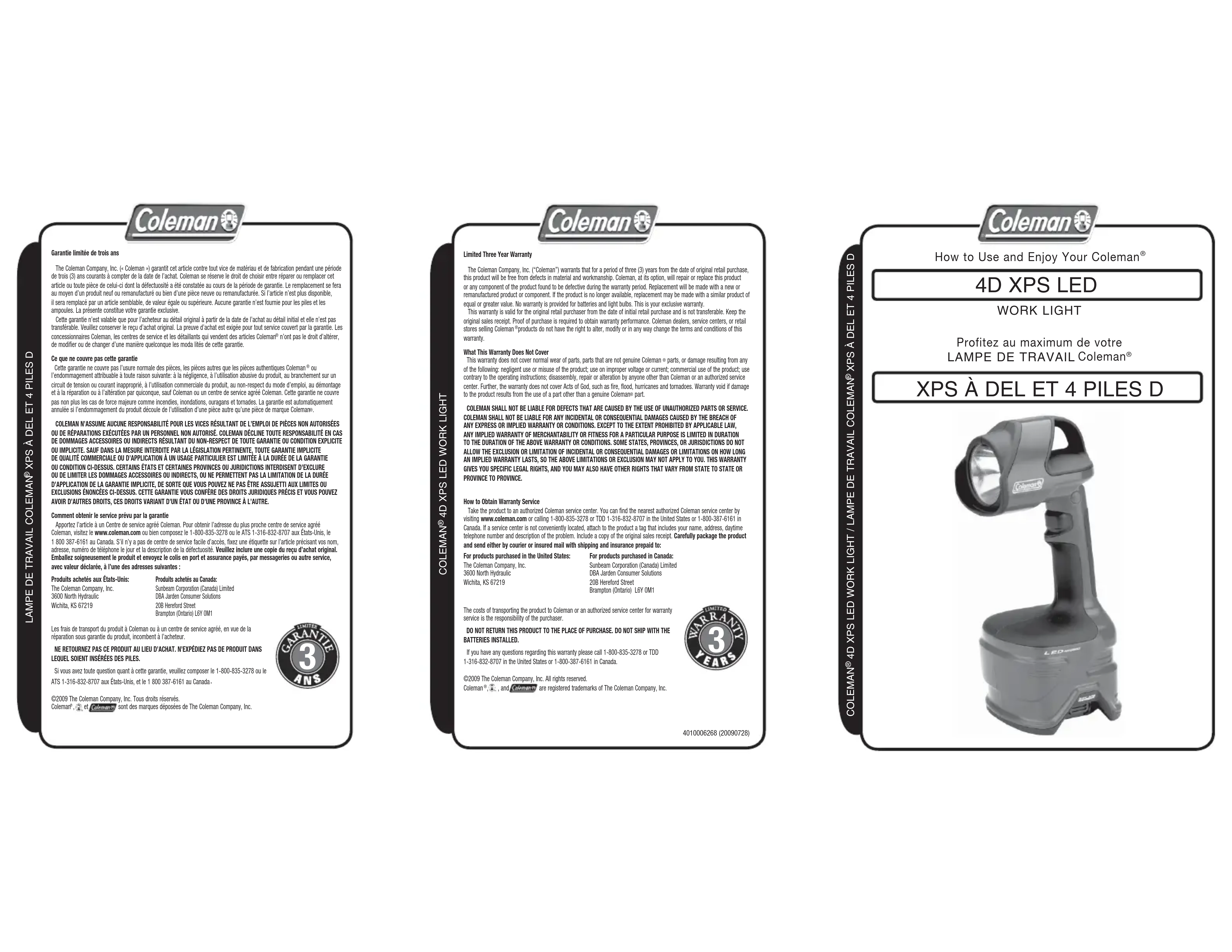 COLEMAN N’ASSUME AUCUNE RESPONSABILITÉ POUR LES VICES RÉSULTANT DE L’EMPLOI DE PIÈCES NON AUTORISÉES OU DE RÉPARATIONS EXÉCUTÉES PAR UN PERSONNEL NON AUTORISÉ. COLEMAN DÉCLINE TOUTE RESPONSABILITÉ EN CAS DE DOMMAGES ACCESSOIRES OU INDIRECTS RÉSULTANT DU NON-RESPECT DE TOUTE GARANTIE OU CONDITION EXPLICITE OU IMPLICITE. SAUF DANS LA MESURE INTERDITE PAR LA LÉGISLATION PERTINENTE, TOUTE GARANTIE IMPLICITE DE QUALITÉ COMMERCIALE OU D’APPLICATION À UN USAGE PARTICULIER EST LIMITÉE À LA DURÉE DE LA GARANTIE OU CONDITION CI-DESSUS. CERTAINS ÉTATS ET CERTAINES PROVINCES OU JURIDICTIONS INTERDISENT D’EXCLURE OU DE LIMITER LES DOMMAGES ACCESSOIRES OU INDIRECTS, OU NE PERMETTENT PAS LA LIMITATION DE LA DURÉE D’APPLICATION DE LA GARANTIE IMPLICITE, DE SORTE QUE VOUS POUVEZ NE PAS ÊTRE ASSUJETTI AUX LIMITES OU EXCLUSIONS ÉNONCÉES CI-DESSUS. CETTE GARANTIE VOUS CONFÈRE DES DROITS JURIDIQUES PRÉCIS ET VOUS POUVEZ AVOIR D’AUTRES DROITS, CES DROITS VARIANT D’UN ÉTAT OU D’UNE PROVINCE À L’AUTRE.Comment obtenir le service prévu par la garantie Apportez l’article à un Centre de service agréé Coleman. Pour obtenir l’adresse du plus proche centre de service agréé Coleman, visitez le www.coleman.com ou bien composez le 1-800-835-3278 ou le ATS 1-316-832-8707 aux États-Unis, le 1 800 387-6161 au Canada. S’il n’y a pas de centre de service facile d’accès, fixez une étiquette sur l’article précisant vos nom, adresse, numéro de téléphone le jour et la description de la défectuosité. Veuillez inclure une copie du reçu d’achat original. Emballez soigneusement le produit et envoyez le colis en port et assurance payés, par messageries ou autre service, avec valeur déclarée, à l’une des adresses suivantes : Les frais de transport du produit à Coleman ou à un centre de service agréé, en vue de la réparation sous garantie du produit, incombent à l’acheteur. NE RETOURNEZ PAS CE PRODUIT AU LIEU D’ACHAT. N’EXPÉDIEZ PAS DE PRODUIT DANS LEQUEL SOIENT INSÉRÉES DES PILES. Si vous avez toute question quant à cette garantie, veuillez composer le 1-800-835-3278 ou le ATS 1-316-832-8707 aux États-Unis, et le 1 800 387-6161 au Canada ©2009 The Coleman Company, Inc. Tous droits réservés.Coleman