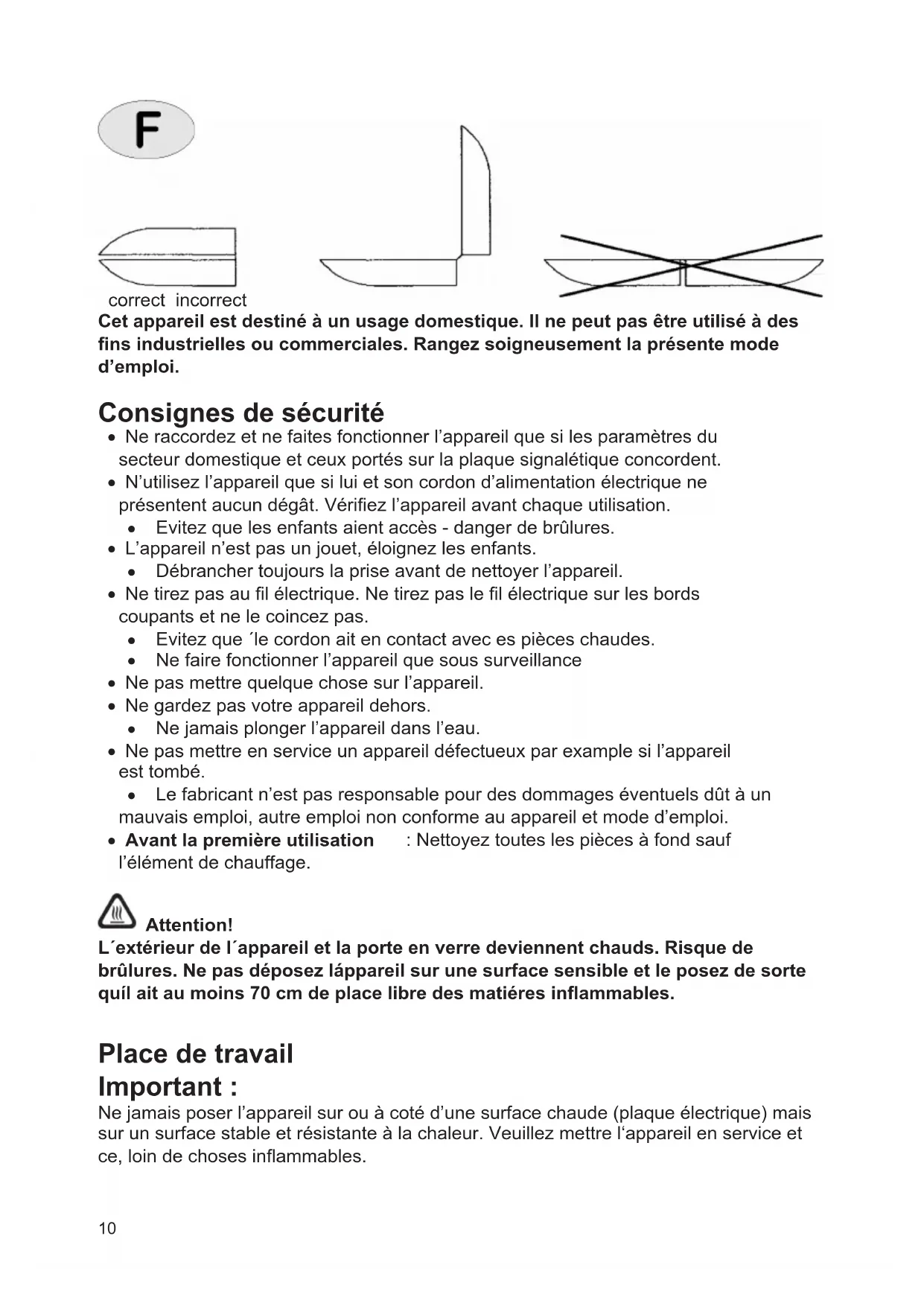 L'extérieur de l'appareil et la porte en verre deviennent chauds. Risque de brûlures. Ne pas déposez l'appareil sur une surface sensible et le posez de sorte qu'il ait au moins 70 cm de place libre des matérières inflammables.