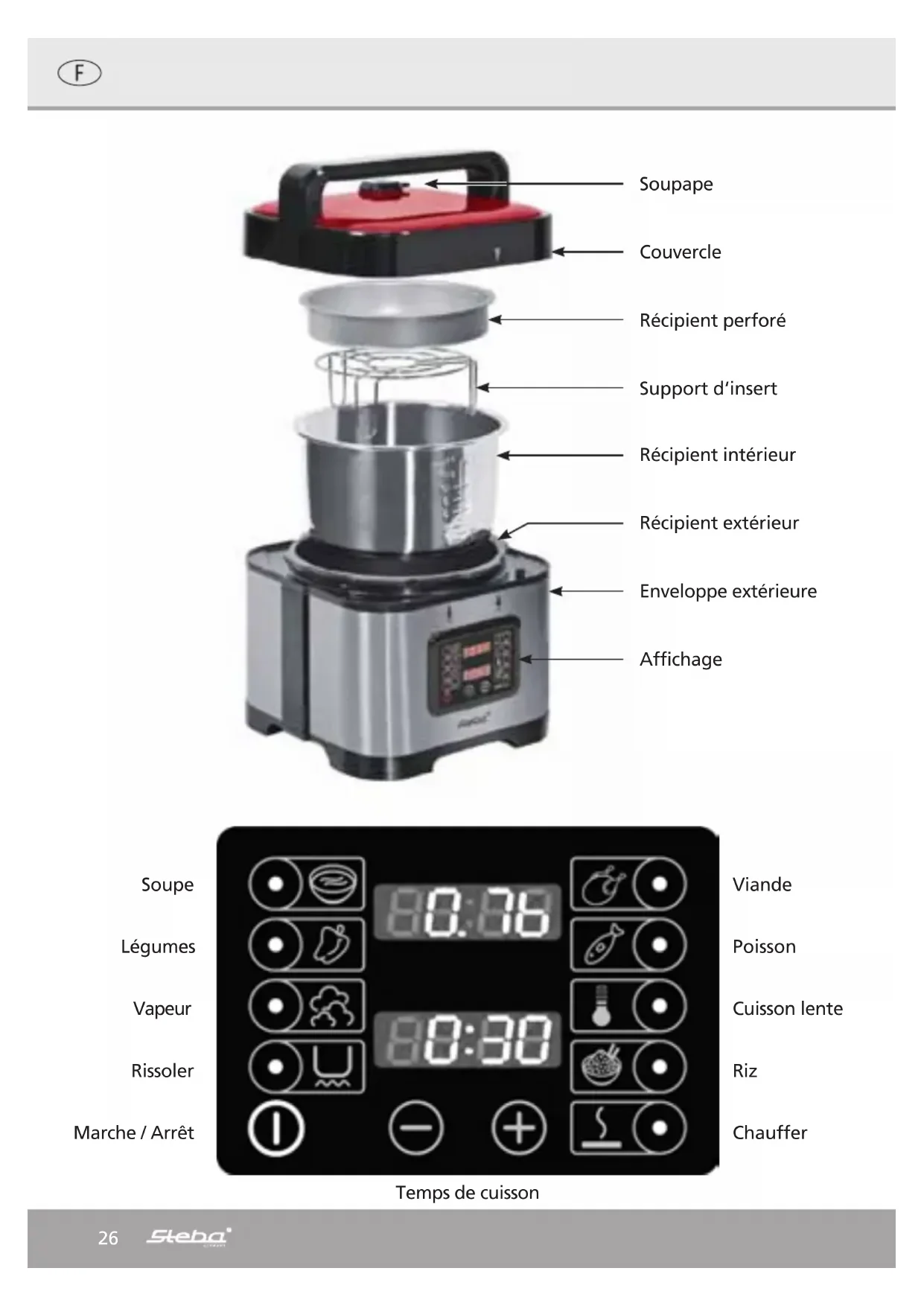 30 min31 Menu Cuisson Le temps se base toujours sur l'aliment avec la plus longue durée de cuisson (p. ex. la viande 40 min., les pommes de terre ou les légumes 10 min.) Dorez la viande (p. ex. la roulade) sur le niveau rissoler puis arroser de liquide. Fermez le couvercle ainsi que la soupape et faîtes cuire au niveau au niveau Viande. (30 min.) Après la fin du program- me, purgez l'air et ouvrez le couvercle. Placez le porte-filtre et l'insert perforé dans le récipient et mettez les légumes ou les pommes de terre dans l'insert. Sélectionnez la touche Légumes et Marche/Arrêt. Après l'écoulement du temps, l'appareil se positionne sur chauffer ou l'on peut ar- rêter la cuisson avec la touche Marche/Arrêt. Le récipient avec la viande, les os, les légumes cuits inclus, etc. ne doit pas être rempli au max. à 75% afin que rien ne déborde ! Pour réduire le temps de cuisson, utilisez l'eau chaude potable. Après l'écoulement du temps de cuisson, positionnez la soupape avec une uillère sur « purge ». La vapeur qui s'échappe est brûlante ! Après chaque cuisson, n'ouvrez le couvercle que lorsque qu'aucune vapeur subsiste dans le récipient ! Suggestions de plats Bouillon de viande : Temps de cuisson à la vapeur env. 30 min. Pot-au-feu (p. ex. mollet), mettez les légumes, les aromates (cube de bouillon – graine de poivre – feuille de laurier) dans le récipient. Remplissez avec de l'eau chaude à 75 %. Couvercle positionnez, verrouillez et fermez la soupape. Sélectionnez la touche Soup et Marche/Arrêt. Bouillon de volaille : Temps de cuisson à la vapeur env. 30 min. Portez 1 ½ litre d'eau salée à ébullition en sélectionnant Rissoler. Mettez la poule (selon la taille à couper evtl. en quatre), les aromates et le bouquet garni dans l'eau bouillante. Comme décrit ci-dessus, verrouiller le couvercle et fermer la soupape. Le Programme Soup enclenchez et sélectionnez la touche Marche/Arrêt. Soupe de pommes de terre : Temps de cuisson à la vapeur env. 10 min. Mettre l'huile, les oignons, les lardons dans le récipient intérieur et faîtes revenir en sélectionnant Rissoler. Couvrez les pommes de terres épluchées et coupées grossièrement, le bouquet garni et les aromates (cube de bouillon, marjolaine et evtl. couenne de lard) d'eau bouillan- te. Verrouiller le couvercle - comme décrit ci-dessus - et fermez la soupape. Le programme Soup et sélectionnez Marche/ Sélectionnez Arrêt.32 Soupe de semoule : Temps de cuisson à la vapeur env. 10 min. Faîtes revenir l‘huile et les oignons dans le récipient intérieur en sélectionnant Rissoler, couvrez d‘eau bouillante et ajouter les aromates (cube de bouillon, poivre, muscade). Dès que la soupe cuit, fermer l‘appareil et la soupape. Sélectionnez la tou- che Soup ainsi que Marche/Arrêt. Après que la soupe n‘ait nécessité qu‘un temps de cuisson à la pression de 4-6 min., minutez sur l‘heure choisie puis arrêtez l‘appareil. Soupe d‘oignons : Temps de cuisson à la vapeur env. 10 min. Faîtes revenir un grande quantité d‘oignons dans de l‘huile en sélectionnant Rissoler jusqu‘à qu‘ils soient translucides et saupoudrez de farine. Couvrez d‘eau et épicez avec des aromates. Fermez le couvercle et la soupape - comme décrit ci-dessus. Sélec- tionnez le programme Soup et Marche/Arrêt Marche/Arrêt. Le temps de cuisson à la vapeur étant très court, servez-vous de la minuterie pour déterminer le temps choisie. Mais il est aussi possible - comme décrit - de programmer le temps de cuisson. Soupe de queue de boeuf : Temps de cuisson à la vapeur env. 30 min. Faîtes rôtir les morceaux de queue de boeuf avec du concentré de tomates en sélec- tionnant Rissoler. Couvrez avec de l‘eau, ajoutez le bouquet garni et les aromates. Fermez le couvercle et la soupape. Sélectionnez le programme Soup et Marche/Arrêt. Soupe de légumes : Temps de cuisson à la vapeur env. 10 min. Faîtes revenir l‘huile, les lardons et les oignons coupées grossièrement en sélection- nant Rissoler Rissoler. Couvrez d‘eau et ajoutez différents légumes de saison (comme p.ex. choix blanc, chou-fleur, haricots, poireaux, carottes etc. grossièrement coupés), des aromates et du concentré de tomates. Fermez le couvercle et la soupape. Sélec- tionnez le programme Soup et Marche/Arrêt. Le temps de cuisson à la vapeur étant très court, servez-vous de la minuterie pour déterminer le temps choisie. Mais il est aussi possible - comme décrit - de programmer le temps de cuisson. Si vous souhaitez obtenir un velouté, mixez la soupe dans le récipient. Chez Steba, il existe un mixeur avec une tige extra-longue (MX 21 - n° d‘article