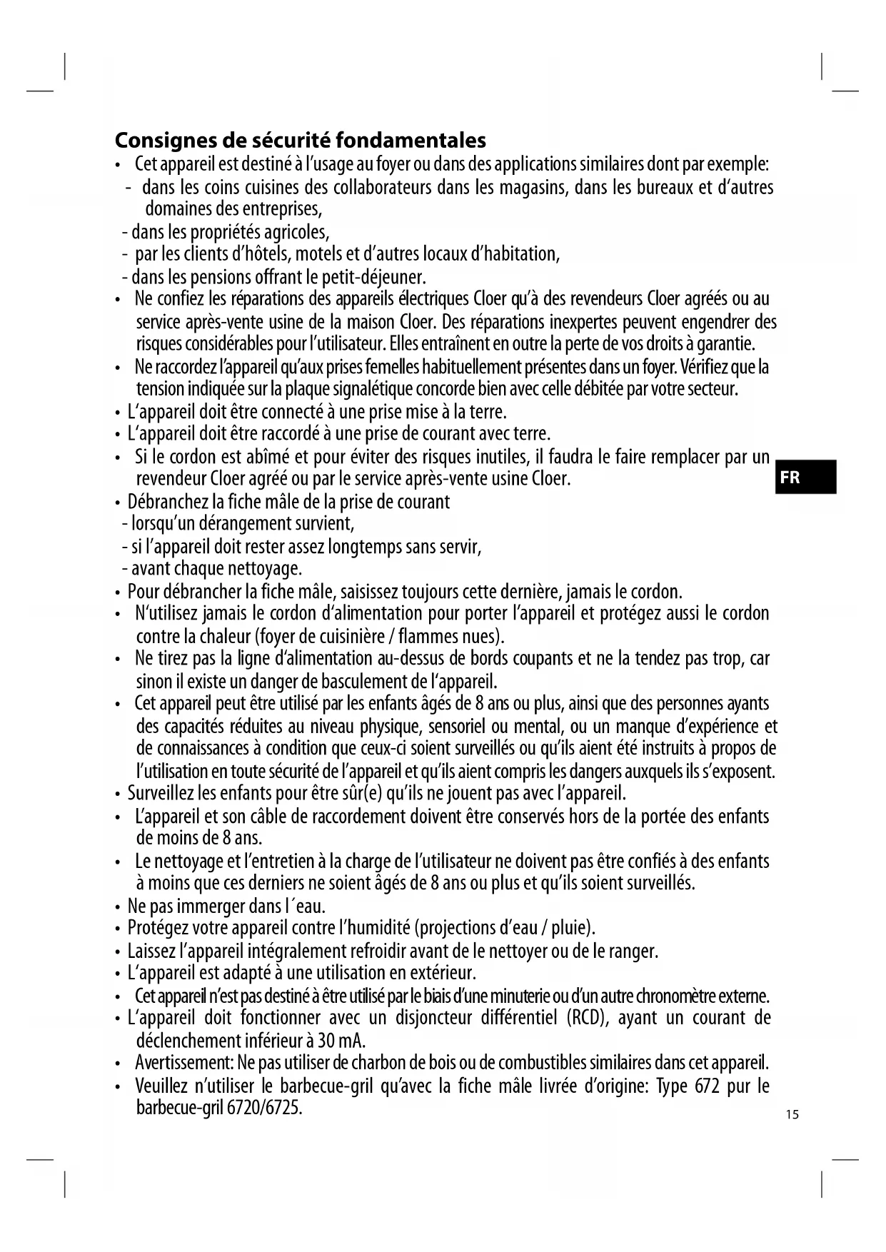 - Veuillez n'utiliser le barbecue-gril qu'avec la fiche mâle livrée d'origine: Type 672 pur le barbecue-gril 6720/6725.