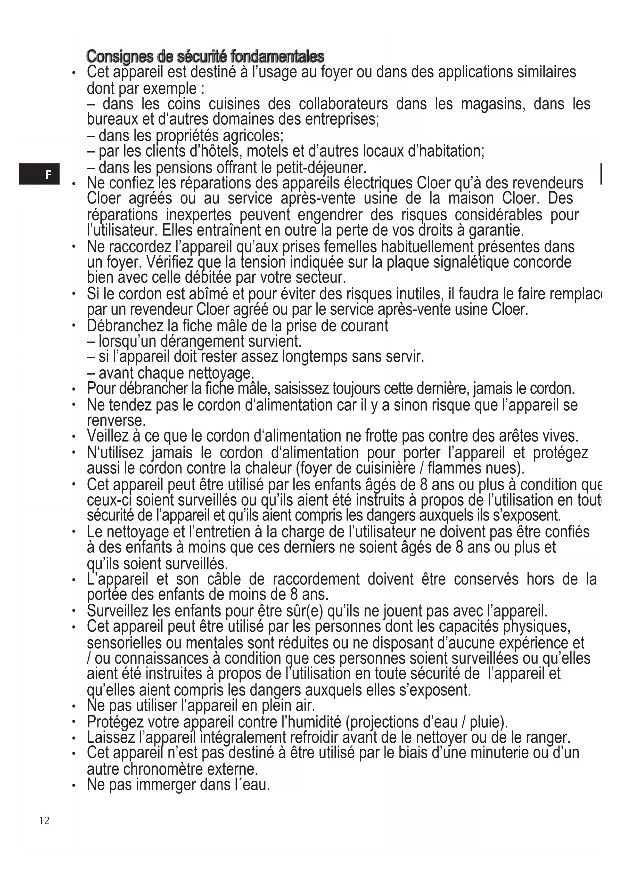 - 12 Consignes de sécurité fondamentales Cet appareil est destiné à l’usage au foyer ou dans des applications similaires dont par exemple : – dans les coins cuisines des collaborateurs dans les magasins, dans les bureaux et d‘autres domaines des entreprises; – dans les propriétés agricoles; – par les clients d’hôtels, motels et d’autres locaux d’habitation; – dans les pensions offrant le petit-déjeuner. Ne conez les réparations des appareils électriques Cloer qu’à des revendeurs Cloer agréés ou au service après-vente usine de la maison Cloer. Des réparations inexpertes peuvent engendrer des risques considérables pour l’utilisateur. Elles entraînent en outre la perte de vos droits à garantie. Ne raccordez l’appareil qu’aux prises femelles habituellement présentes dans un foyer. Vériez que la tension indiquée sur la plaque signalétique concorde bien avec celle débitée par votre secteur. Si le cordon est abîmé et pour éviter des risques inutiles, il faudra le faire remplacer par un revendeur Cloer agréé ou par le service après-vente usine Cloer. Débranchez la che mâle de la prise de courant – lorsqu’un dérangement survient. – si l’appareil doit rester assez longtemps sans servir. – avant chaque nettoyage. Pour débrancher la che mâle, saisissez toujours cette dernière, jamais le cordon. Ne tendez pas le cordon d‘alimentation car il y a sinon risque que l’appareil se renverse. Veillez à ce que le cordon d‘alimentation ne frotte pas contre des arêtes vives. N‘utilisez jamais le cordon d‘alimentation pour porter l’appareil et protégez aussi le cordon contre la chaleur (foyer de cuisinière / ammes nues). Cet appareil peut être utilisé par les enfants âgés de 8 ans ou plus à condition que ceux-ci soient surveillés ou qu’ils aient été instruits à propos de l’utilisation en toute sécurité de l’appareil et qu’ils aient compris les dangers auxquels ils s’exposent. Le nettoyage et l’entretien à la charge de l’utilisateur ne doivent pas être conés à des enfants à moins que ces derniers ne soient âgés de 8 ans ou plus et qu’ils soient surveillés. L’appareil et son câble de raccordement doivent être conservés hors de la portée des enfants de moins de 8 ans. Surveillez les enfants pour être sûr(e) qu’ils ne jouent pas avec l’appareil. Cet appareil peut être utilisé par les personnes dont les capacités physiques, sensorielles ou mentales sont réduites ou ne disposant d’aucune expérience et / ou connaissances à condition que ces personnes soient surveillées ou qu’elles aient été instruites à propos de l’utilisation en toute sécurité de l’appareil et qu’elles aient compris les dangers auxquels elles s’exposent. Ne pas utiliser l‘appareil en plein air. Protégez votre appareil contre l’humidité (projections d’eau / pluie). Laissez l’appareil intégralement refroidir avant de le nettoyer ou de le ranger. Cet appareil n’est pas destiné à être utilisé par le biais d’une minuterie ou d’un autre chronomètre externe. Ne pas immerger dans l´eau.