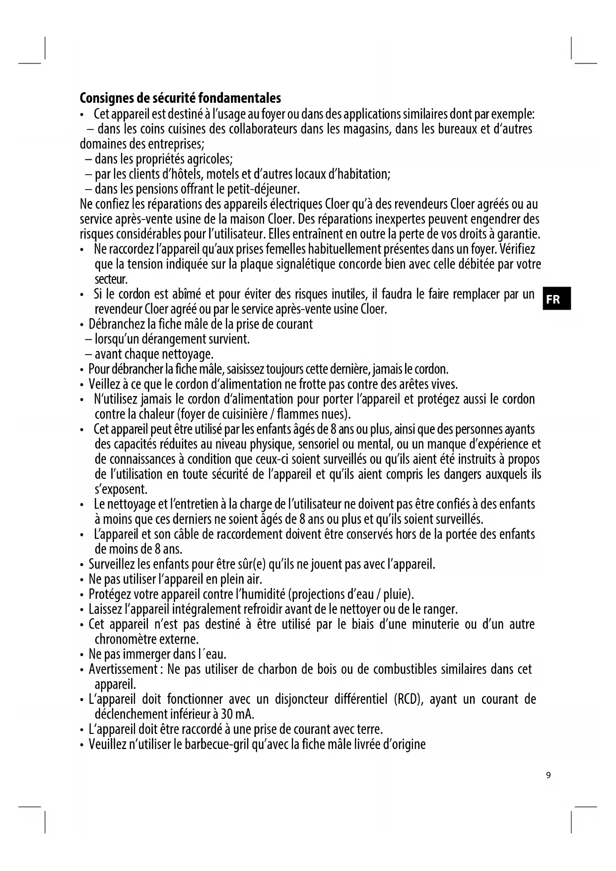 - Cet appareil est destiné à l’usage au foyer ou dans des applications similaires dont par exemple: – dans les coins cuisines des collaborateurs dans les magasins, dans les bureaux et d‘autres domaines des entreprises; – dans les propriétés agricoles; – par les clients d’hôtels, motels et d’autres locaux d’habitation; – dans les pensions offrant le petit-déjeuner. Ne confiez les réparations des appareils électriques Cloer qu’à des revendeurs Cloer agréés ou au service après-vente usine de la maison Cloer. Des réparations inexpertes peuvent engendrer des risques considérables pour l’utilisateur. Elles entraînent en outre la perte de vos droits à garantie.