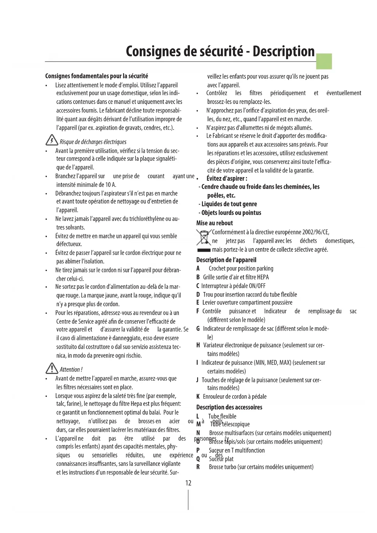Consignes de sécurité - Description