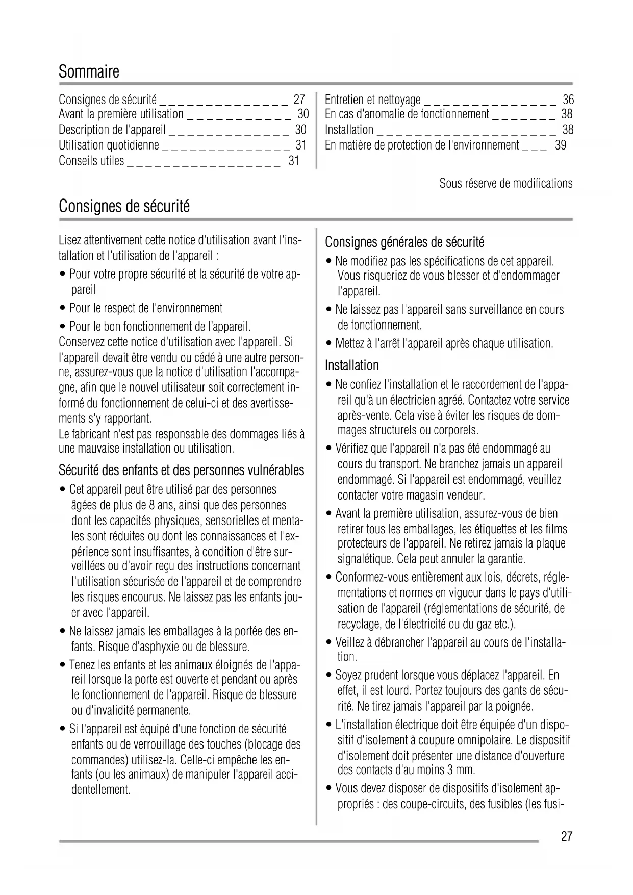 Consignes de sécurité _ _ _ _ _ _ _ _ _ _ _ _ _ _ 27
