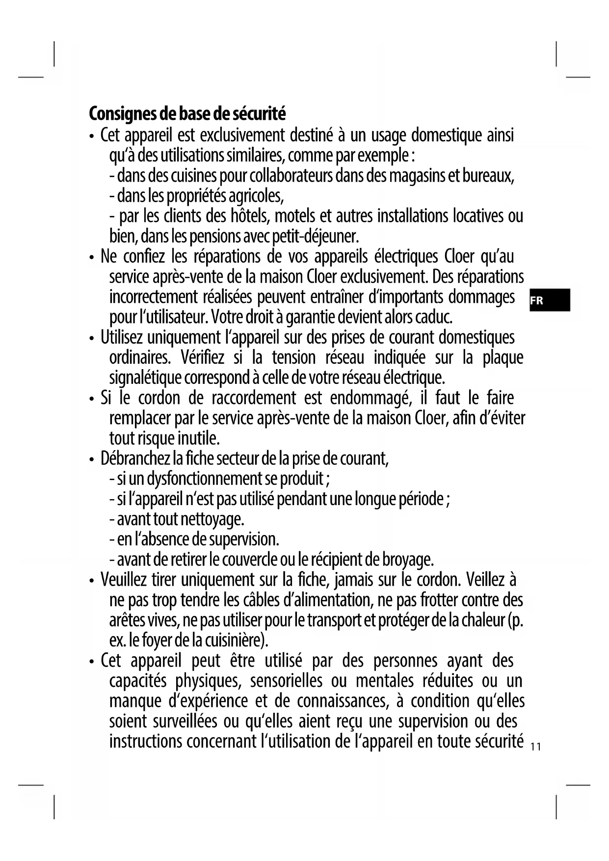 Les apparèils électriques correspondant aux directives actuelles et aux prescriptions en matière de sécurité de l'UE. Si vous appareil Cloer présente un dysfonctionnement, ou qu'il ne fonctionne pas correctement, veuilles consulter votre distributeur/agree ou le service après-vente d'usine de Cloer.