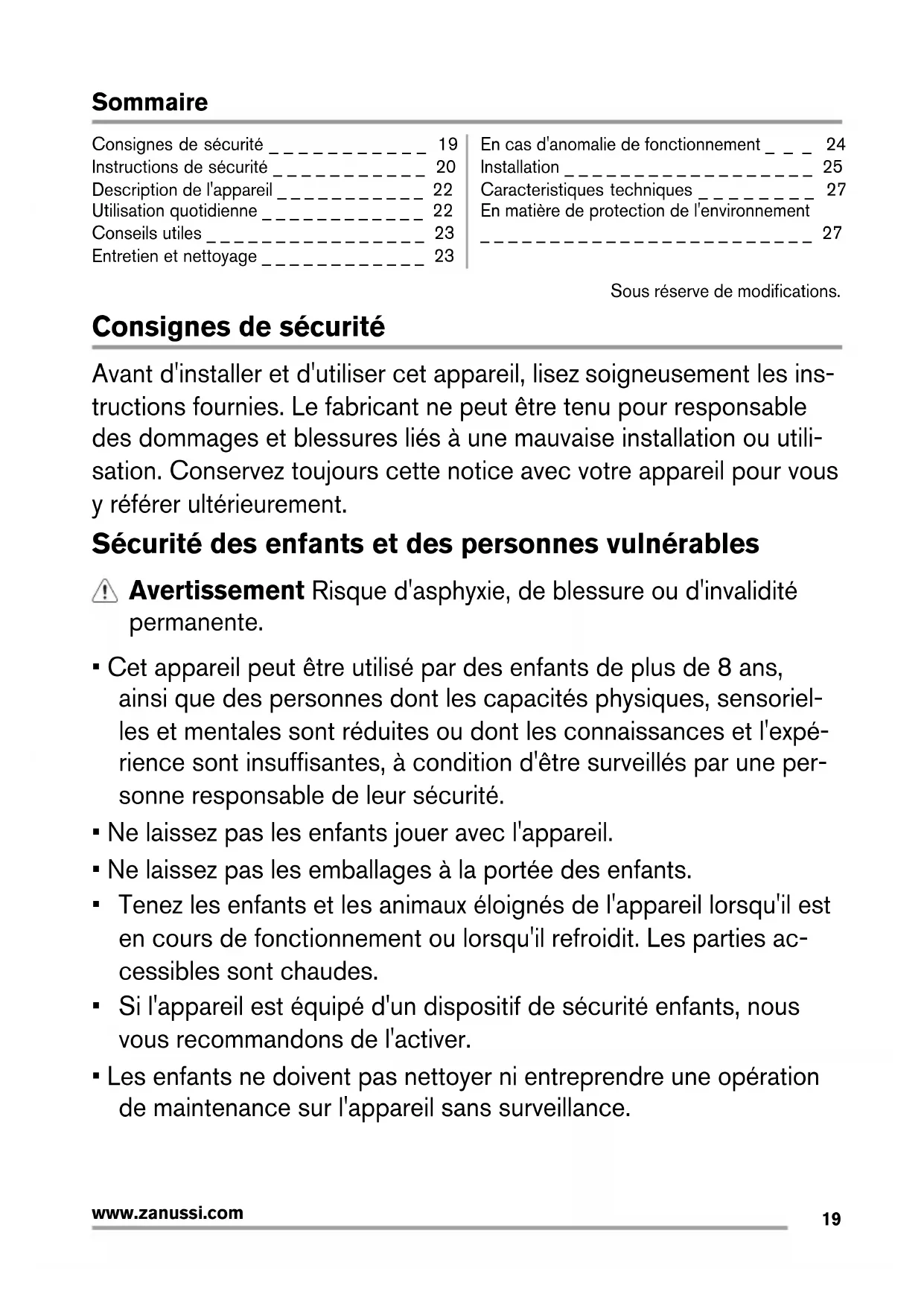 Consignes de sécurité _ _ _ _ _ _ _ _ _ _ _ 19