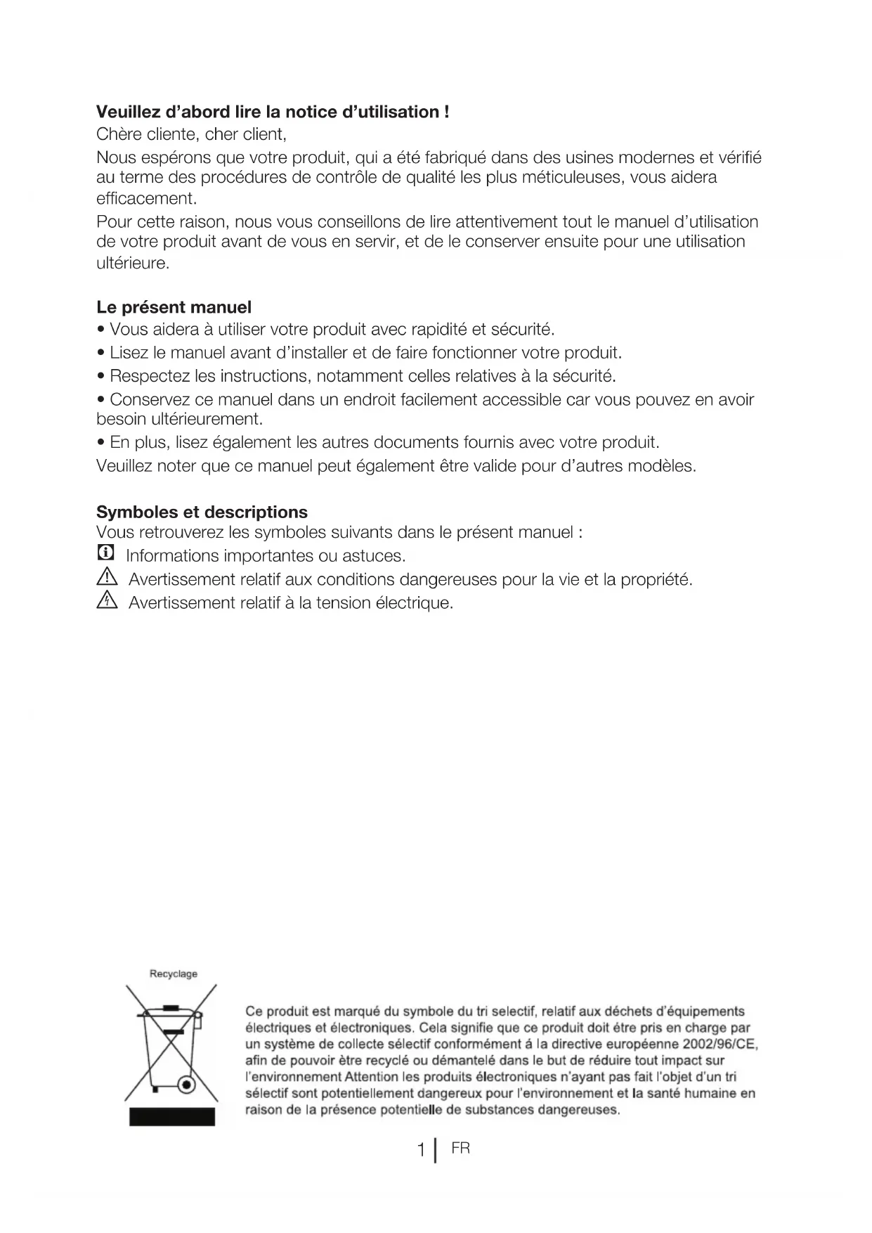 - Lisez le manuel avant d’installer et de faire fonctionner votre produit.