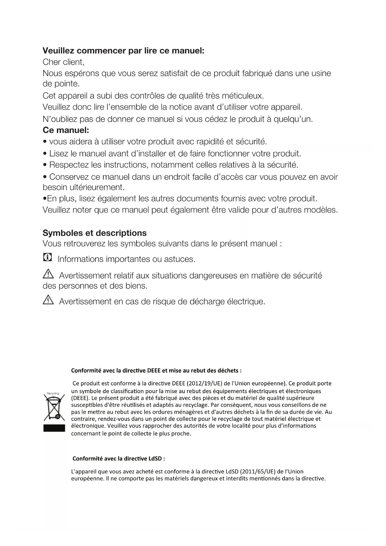 Conformité avec la direcve DEEE et mise au rebut des déchets : Ce produit est conforme à la direcve DEEE (2012/19/UE) de l'Union européenne). Ce produit porte un symbole de classificaon pour la mise au rebut des équipements électriques et électroniques (DEEE). Le présent produit a été fabriqué avec des pièces et du matériel de qualité supérieure suscepbles d'être réulisés et adaptés au recyclage. Par conséquent, nous vous conseillons de ne pas le mere au rebut avec les ordures ménagères et d'autres déchets à la fin de sa durée de vie. Au contraire, rendez-vous dans un point de collecte pour le recyclage de tout matériel électrique et électronique. Veuillez vous rapprocher des autorités de votre localité pour plus d'informaons concernant le point de collecte le plus proche. Conformité avec la direcve LdSD : L'appareil que vous avez acheté est conforme à la direcve LdSD (2011/65/UE) de l'Union européenne. Il ne comporte pas les matériels dangereux et interdits menonnés dans la direcve.FR