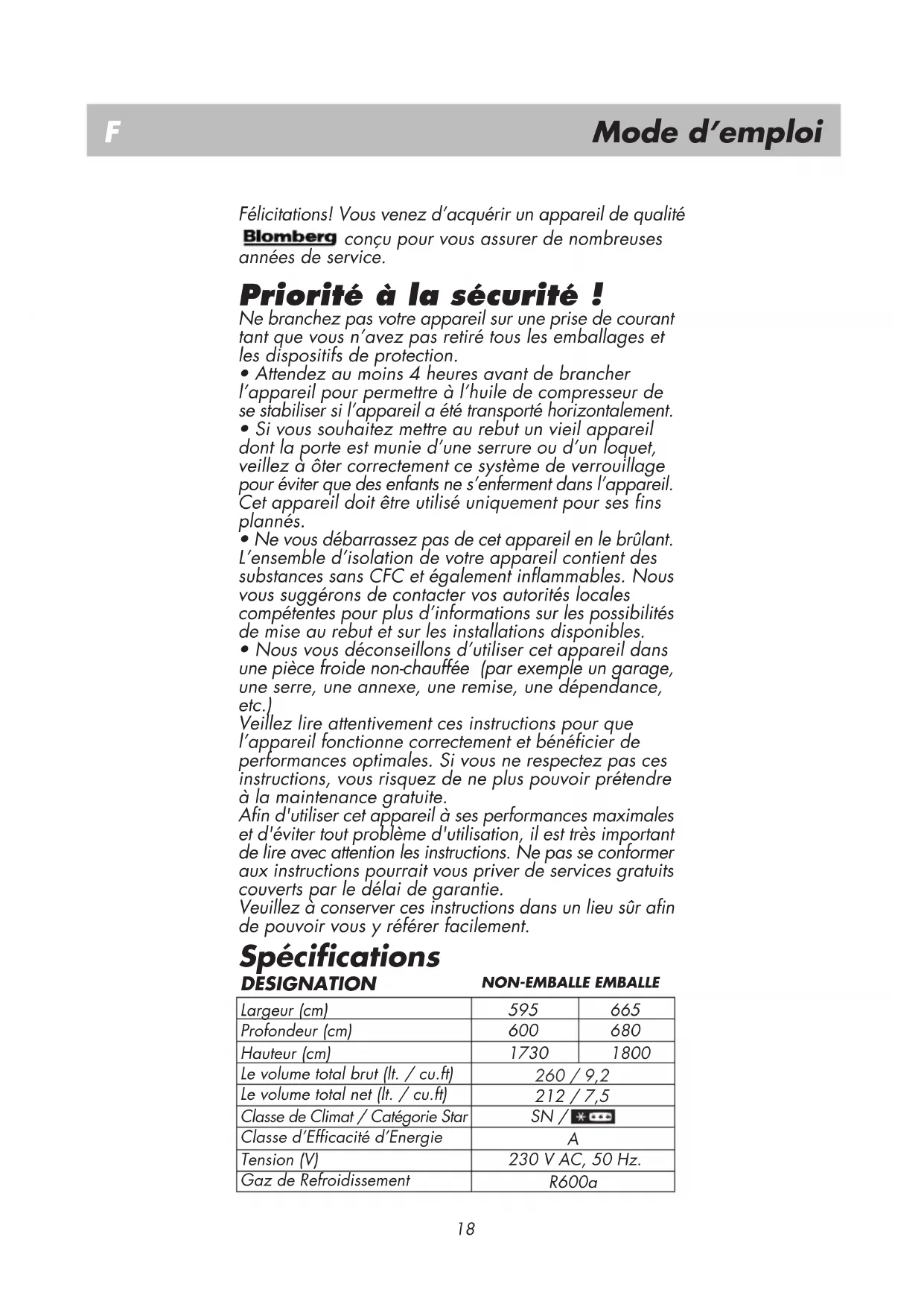 09-17 InhaltPriorité à la sécurité/18Spécifications /18Exigences électriques/19Notice de transport/19Notice d'installation/19Contrôle de la température et répartition/20Avant de commencer/20Témoins lumineux /21Conservation des aliments surgelés/21Congélation d’aliments frais/21Congélation rapide /21Fabrication de glaçons/22Dégivrage/22Connaître votre appareil ménager/22Nettoyage et entretien/23Inverser la porte/23A faire et à ne pas faire/24Dépannage /25
