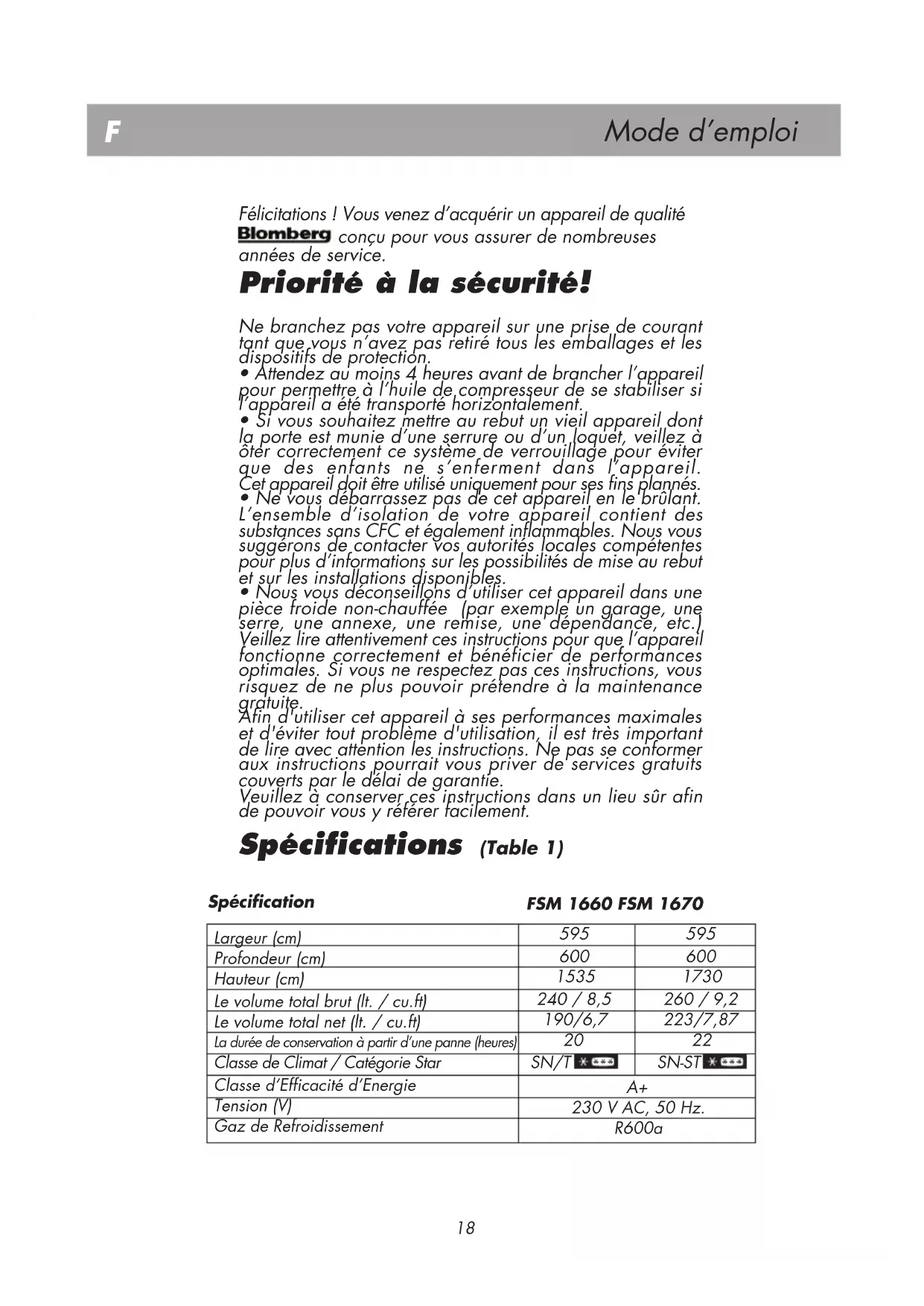 - Nous vous déconseillons d’utiliser cet appareil dans une pièce froide non-chauffée (par exemple un garage, une serre, une annexe, une remise, une dépendance, etc.) Veillez lire attentivement ces instructions pour que l’appareil fonctionne correctement et bénéficier de performances optimales. Si vous ne respectez pas ces instructions, vous risquez de ne plus pouvoir prétendre à la maintenance gratuite. Afin d'utiliser cet appareil à ses performances maximales et d'éviter tout problème d'utilisation, il est très important de lire avec attention les instructions. Ne pas se conformer aux instructions pourrait vous priver de services gratuits couverts par le délai de garantie. Veuillez à conserver ces instructions dans un lieu sûr afin de pouvoir vous y référer facilement. Félicitations ! Vous venez d’acquérir un appareil de qualité conçu pour vous assurer de nombreuses années de service. Spécifications (Table 1) Largeur (cm) Profondeur (cm) Hauteur (cm) Le volume total brut (lt. / cu.ft) Le volume total net (lt. / cu.ft) La durée de conservation à partir d’une panne (heures) Classe de Climat / Catégorie Star Classe d’Efficacité d’Energie Tension (V) Gaz de Refroidissement Spécification FSM 1660 FSM 1670