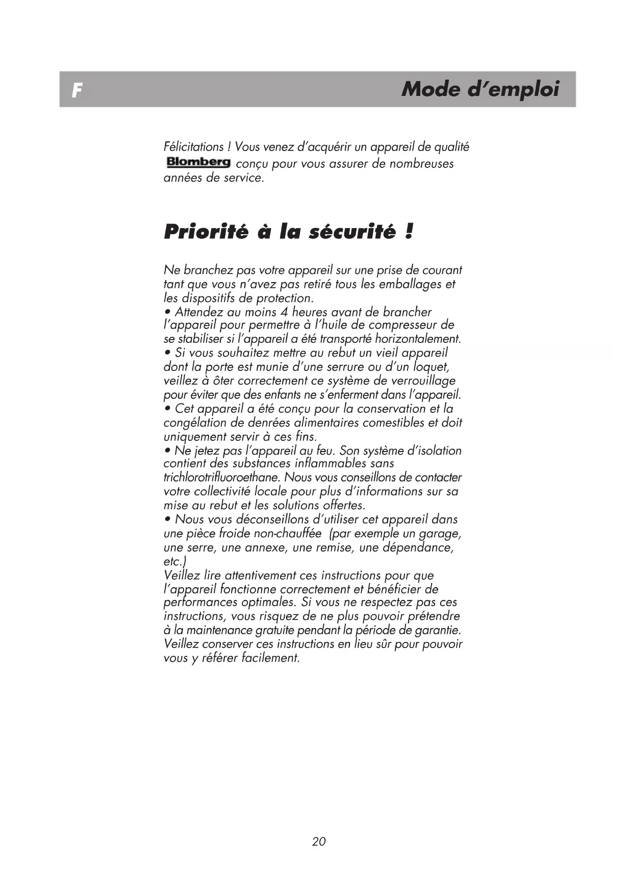 - Nous vous déconseillons d’utiliser cet appareil dans une pièce froide non-chauffée (par exemple un garage, une serre, une annexe, une remise, une dépendance, etc.) Veillez lire attentivement ces instructions pour que l’appareil fonctionne correctement et bénéficier de performances optimales. Si vous ne respectez pas ces instructions, vous risquez de ne plus pouvoir prétendre à la maintenance gratuite pendant la période de garantie. Veillez conserver ces instructions en lieu sûr pour pouvoir vous y référer facilement. Félicitations ! Vous venez d’acquérir un appareil de qualité conçu pour vous assurer de nombreuses années de service. Mode d’emploiF