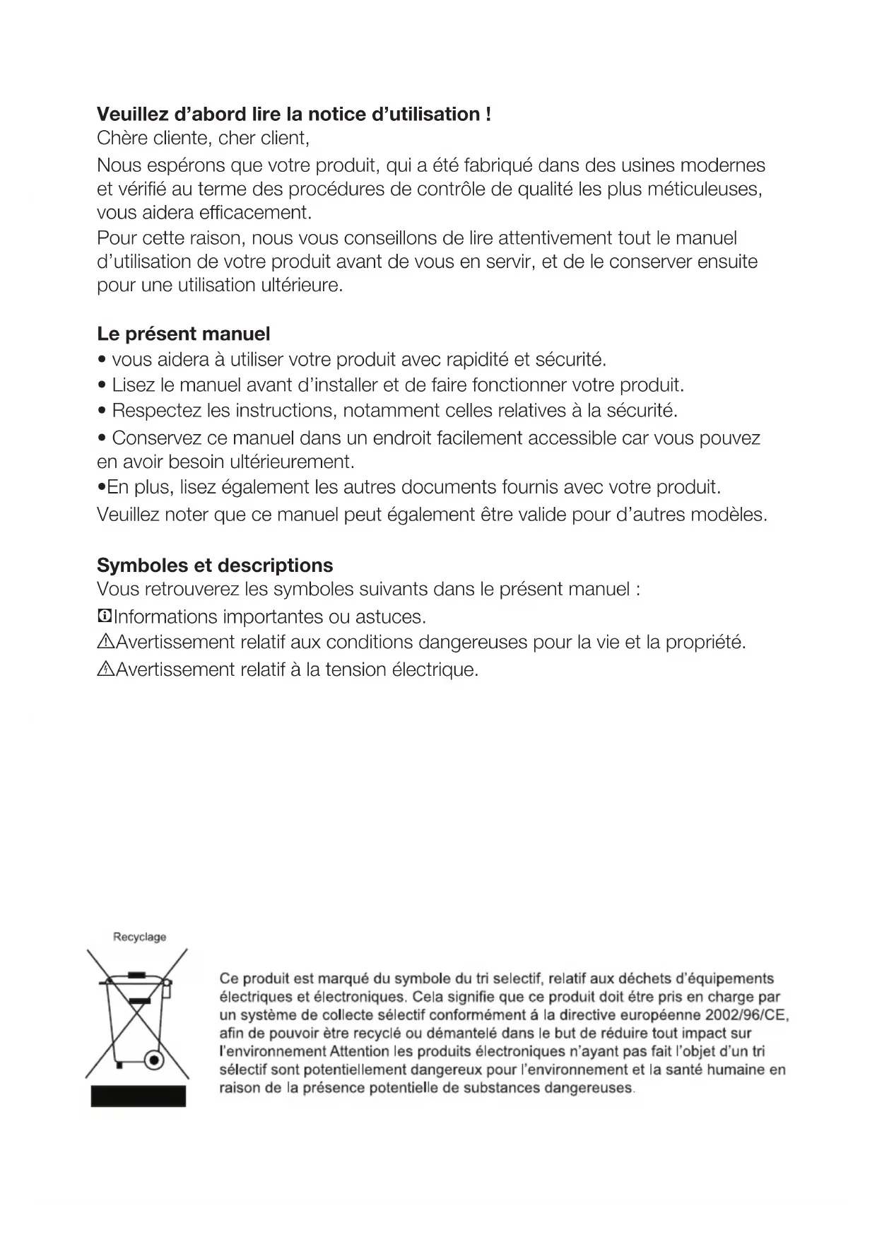 - Lisez le manuel avant d’installer et de faire fonctionner votre produit.