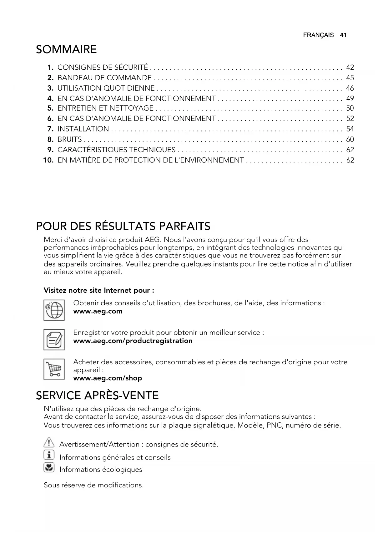 N'utilisez que des pièces de rechange d'origine. Avant de contacter le service, assurez-vous de disposer des informations suivantes : Vous trouverez ces informations sur la plaque signalétique. Modèle, PNC, numéro de série. Avertissement/Attention : consignes de sécurité. Informations générales et conseils Informations écologiques Sous réserve de modifications. FRANÇAIS 411.